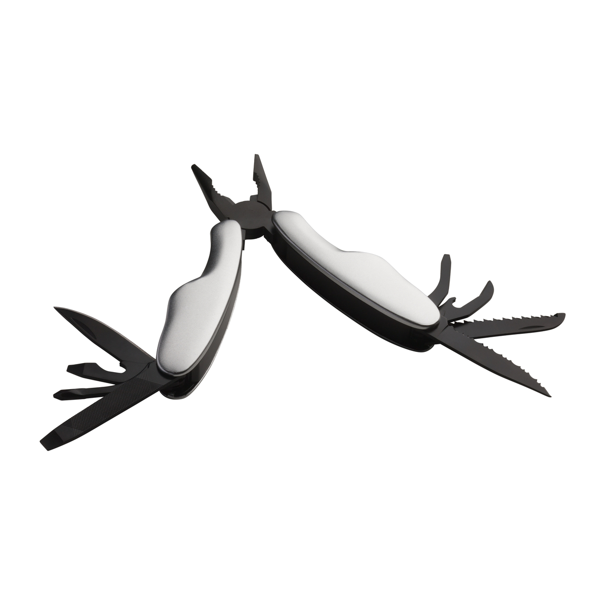 Das Multifunktionswerkzeug überzeugt durch seine solide Verarbeitung und seine schicken schwarzen Funktionselemente. Insgesamt neun Elemente mit verschiedenen Funktionen bietet das Multi-Tool: Zange mit Seitenschneider, Messer, Feile, Kreuzschraubendreher, Schlitzschraubendreher, schmal, mittel und breit, Flaschenöffner, Universalsäge, Holzsäge und Dosenöffner. Das praktische Multifunktionswerkzeug wird zusammengeklappt in einer schwarzen, textilen Tasche mit Gürtelschlaufe geliefert. Eine Veredelung mit einer edlen Lasergravur ist auf den silbernen Griffflächen möglich.