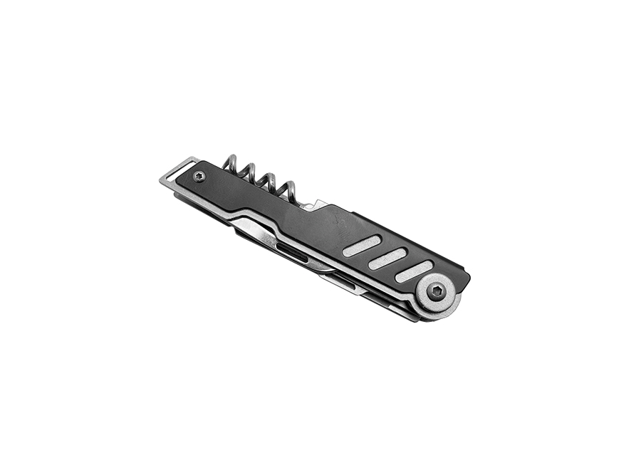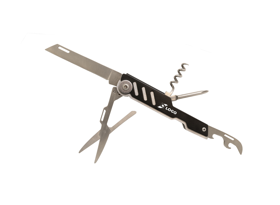 Elemente komplett aus hochbeständigem Edelstahl (2CR13). Griff aus Aluminium. Torx-Schraubmontage. 6 Funktionen: Messer, Flaschenöffner, Dosenöffner, Kreuzschlitzschraubendreher, Schere, Korkenzieher mit 4 Spiralen. Lochung für Ring oder Kordel. Lieferung in einem graumelierten RPET-Etui. Die Vorteile in Kürze: - 2CR13-Edelstahlelemente für hervorragende Beständigkeit gegen Oxidation und Verdrehungen. - Torx-Schraubmontage, um Reibung beim Öffnen zu reduzieren und eine ordnungsgemäße Funktion im Laufe der Zeit zu gewährleisten. - Ein Korkenzieher mit 4 Spiralen, während die meisten Multifunktionsmesser nur 3 bieten. br>- Geliefert in einem Etui aus RPET (recyceltes Material) anstelle Einwegverpackung.