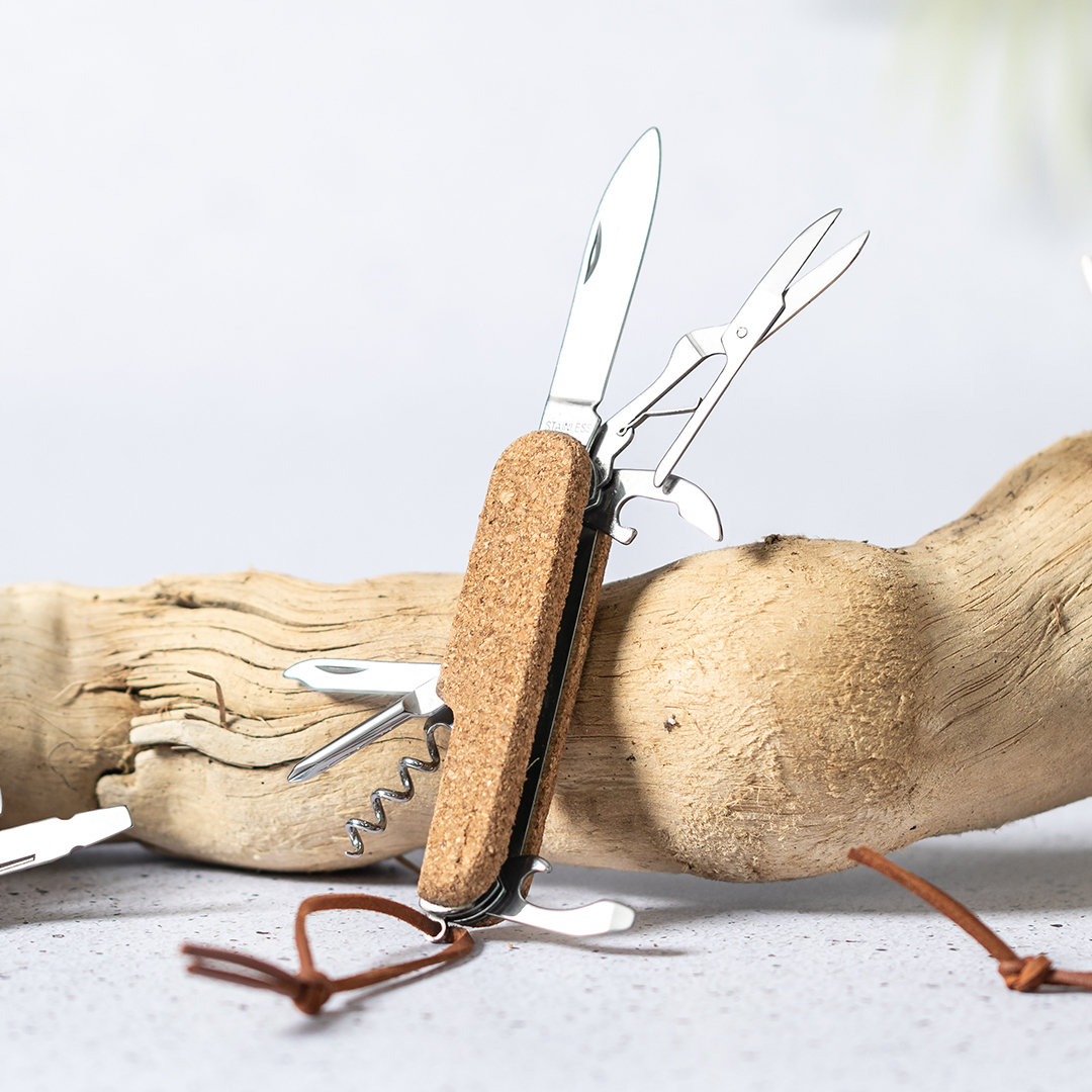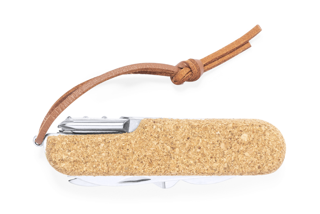 Mehrzweckmesser der Nature-Linie mit einem widerstandsfähigen Körper aus Edelstahl und einem Griff aus Naturkork. Mit 9 Funktionen, darunter Taschenmesser, Öffner, Schere, Feile, Schraubendreher mit Schlitz- und Kreuzschlitzspitze, Korkenzieher ... Passendes Schlüsselband aus PU-Leder, präsentiert in einer individuellen Box mit Kraftdesign.