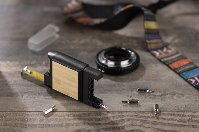 Das Multifunktionstool ALGO ist mit einem 3-Meter-Maßband, einer Wasserwaage und einem eingebauten Schraubendreher mit austauschbaren Bits ausgestattet. Es ermöglicht Messen, Montieren und Nivellieren.