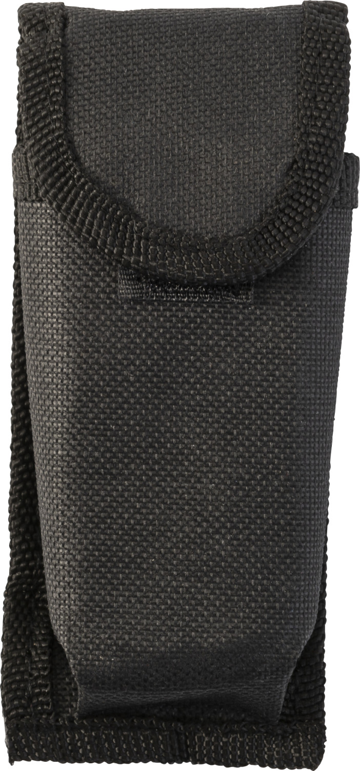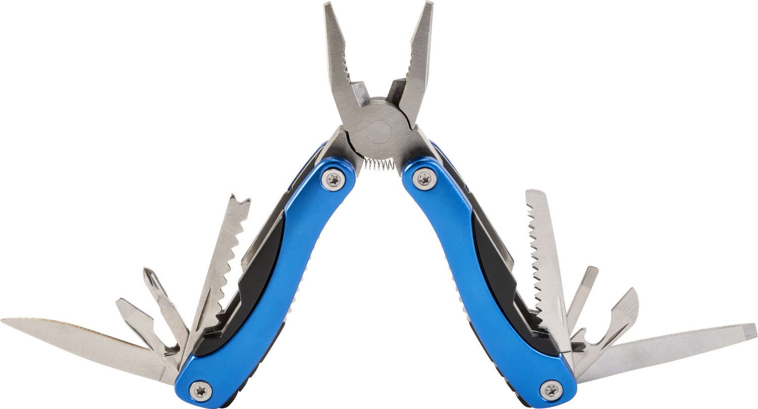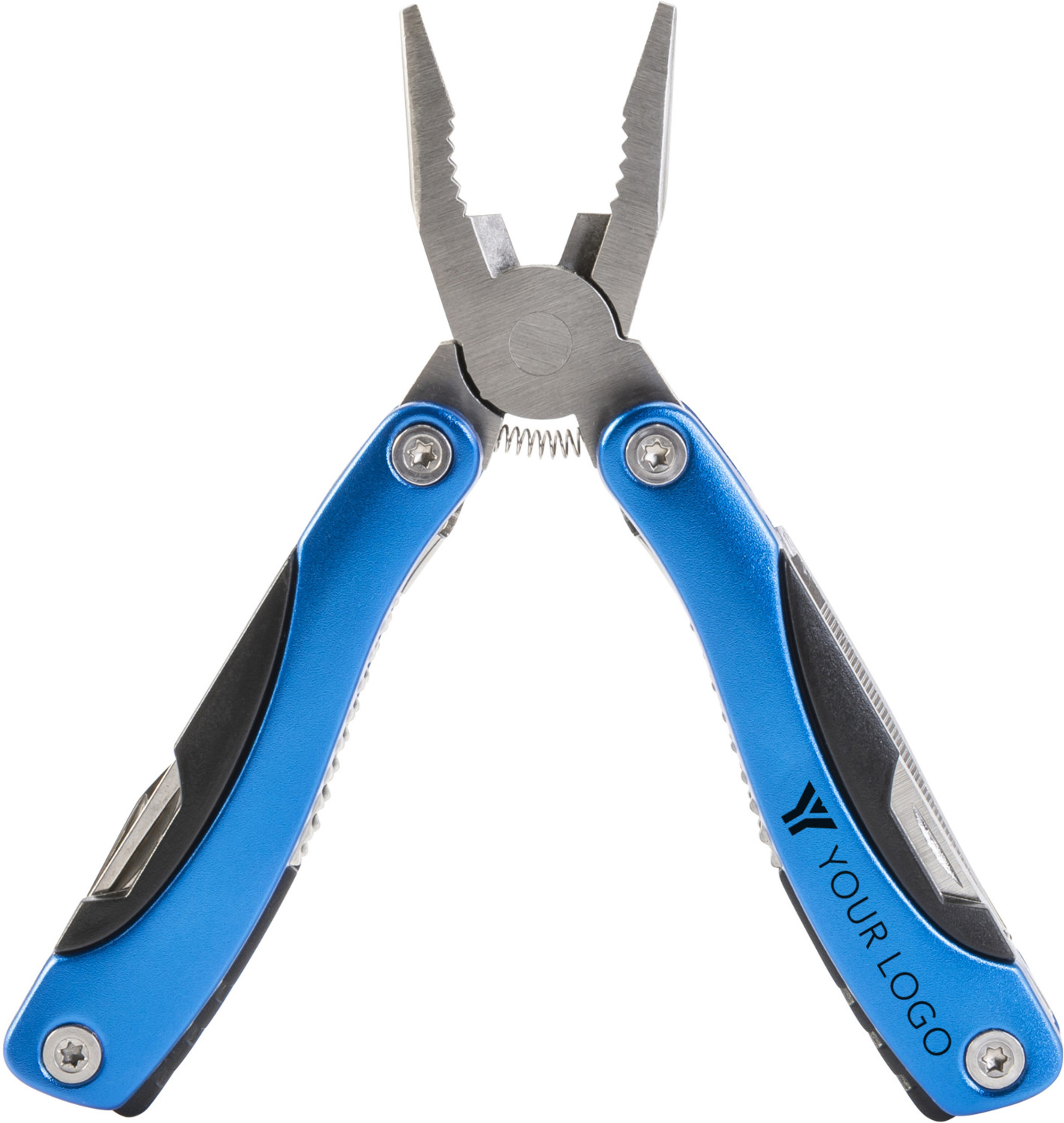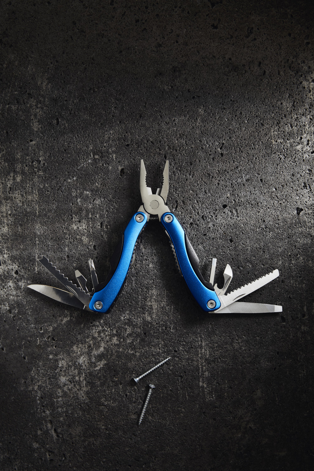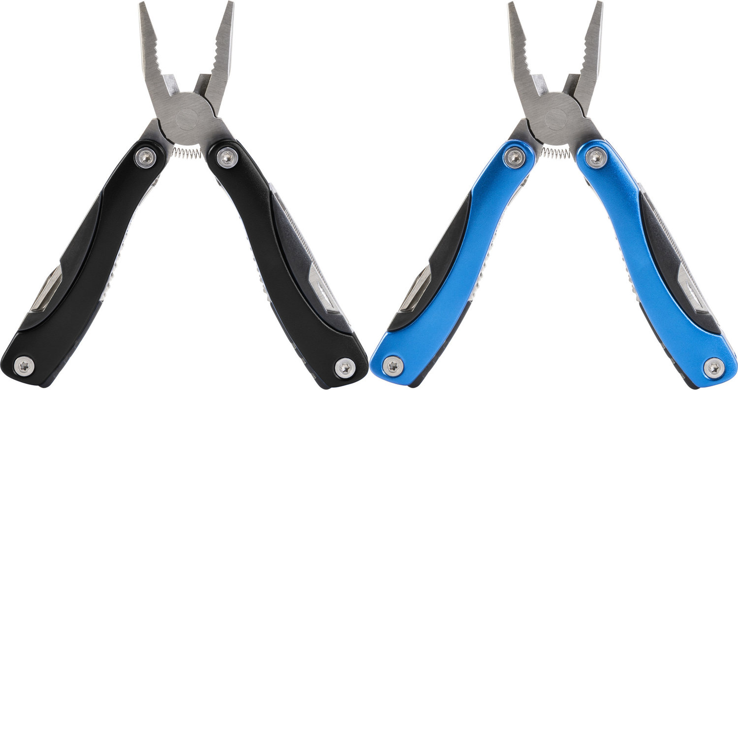 Multifunktionswerkzeug aus Metall und Kunststoff. Funktionen: Zange, Säge, Messer, zwei Schraubendreher (Kreuz und Schlitz), Feile, Flaschen- und Dosenöffner, Fischschaber, Nussknacker und Lineal mit Zoll-Angabe. In einem kleinen Beutel geliefert.