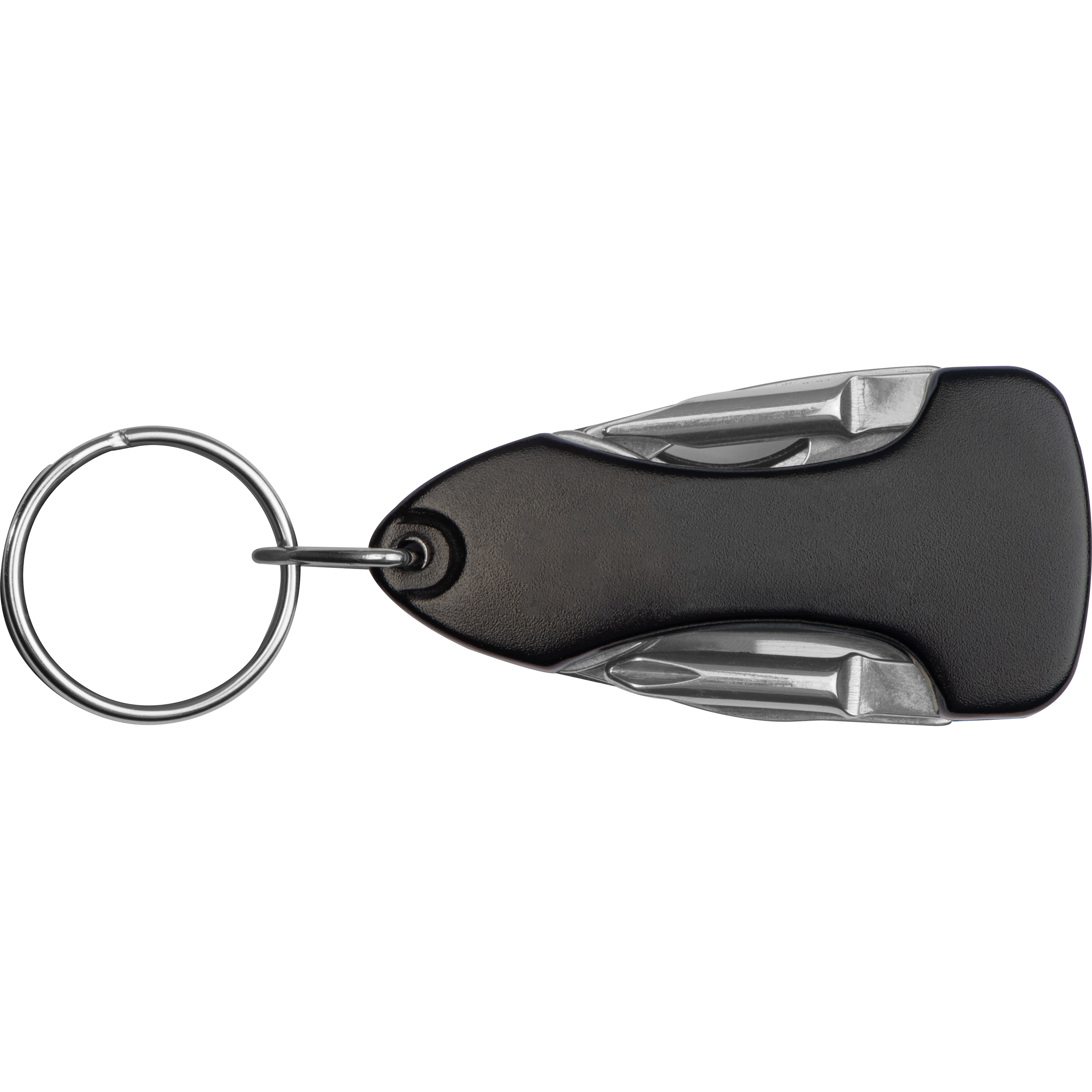 Multitool mit Schlüsselanhänger, LED Licht, Flach- und Kreuzschraubendreher, Flaschenöffner und Messer aus Metall. Eine Lasergravur auf der schwarzen Fläche rundet diesen Streuartikel ab.