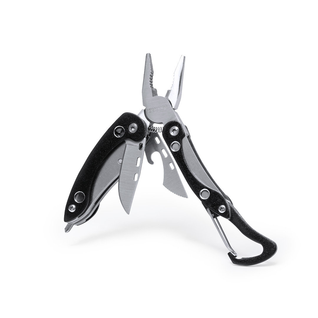Multi-Tool von Orizons mit 6 Edelstahl-Funktionen und Aluminiumgriff in lebendigen Farben. Mit Zange, Taschenmesser, Dosenöffner mit Schlitzschraubendreher mit Flaschenöffnerfunktion, Kreuzschraubendreher und Karabiner. Präsentiert in einer attraktiven Designbox mit dem Markenlogo.