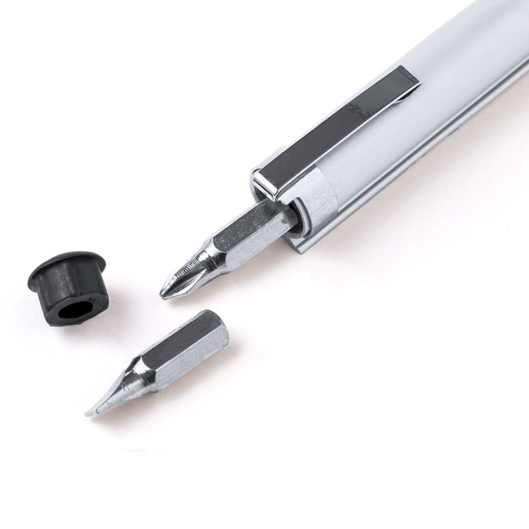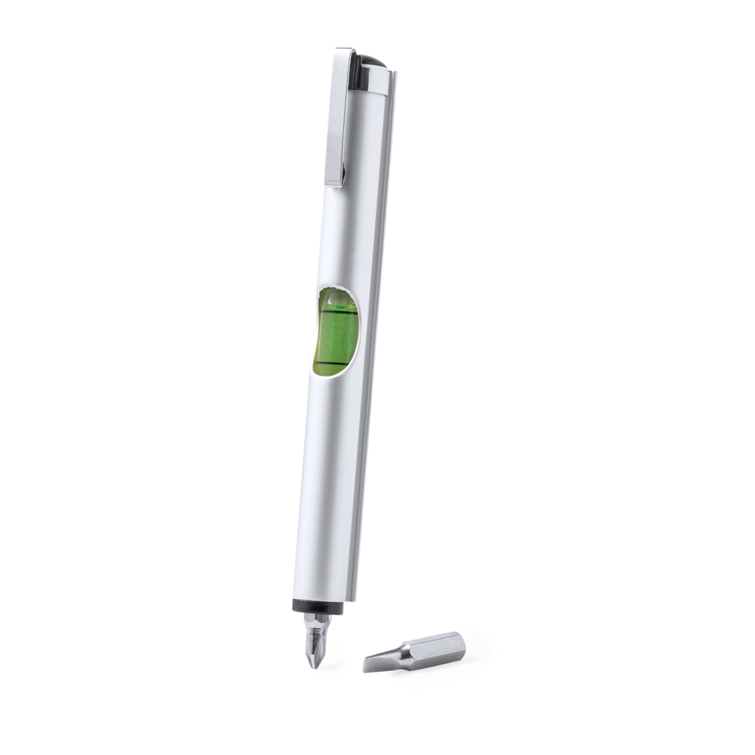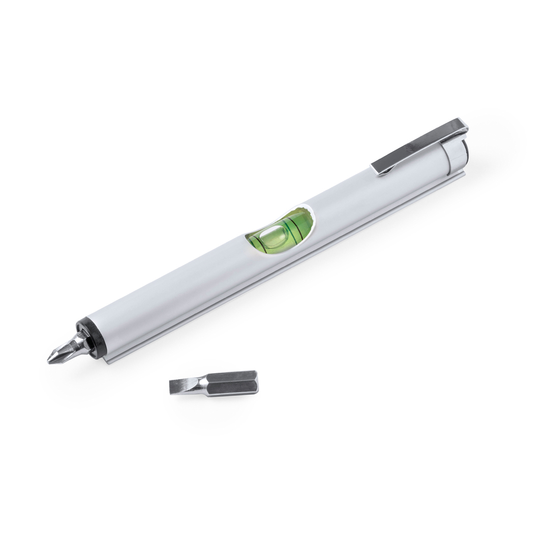 Praktisches Multitool aus Aluminium, mit integriertem Füllstandsmesser im Gehäuse und zwei Schraubendreherköpfen (Flach- und Kreuzschlitzschraubendreher) im Inneren. Mit verchromtem Metallclip und präsentiert in einer Kraft-Designbox.