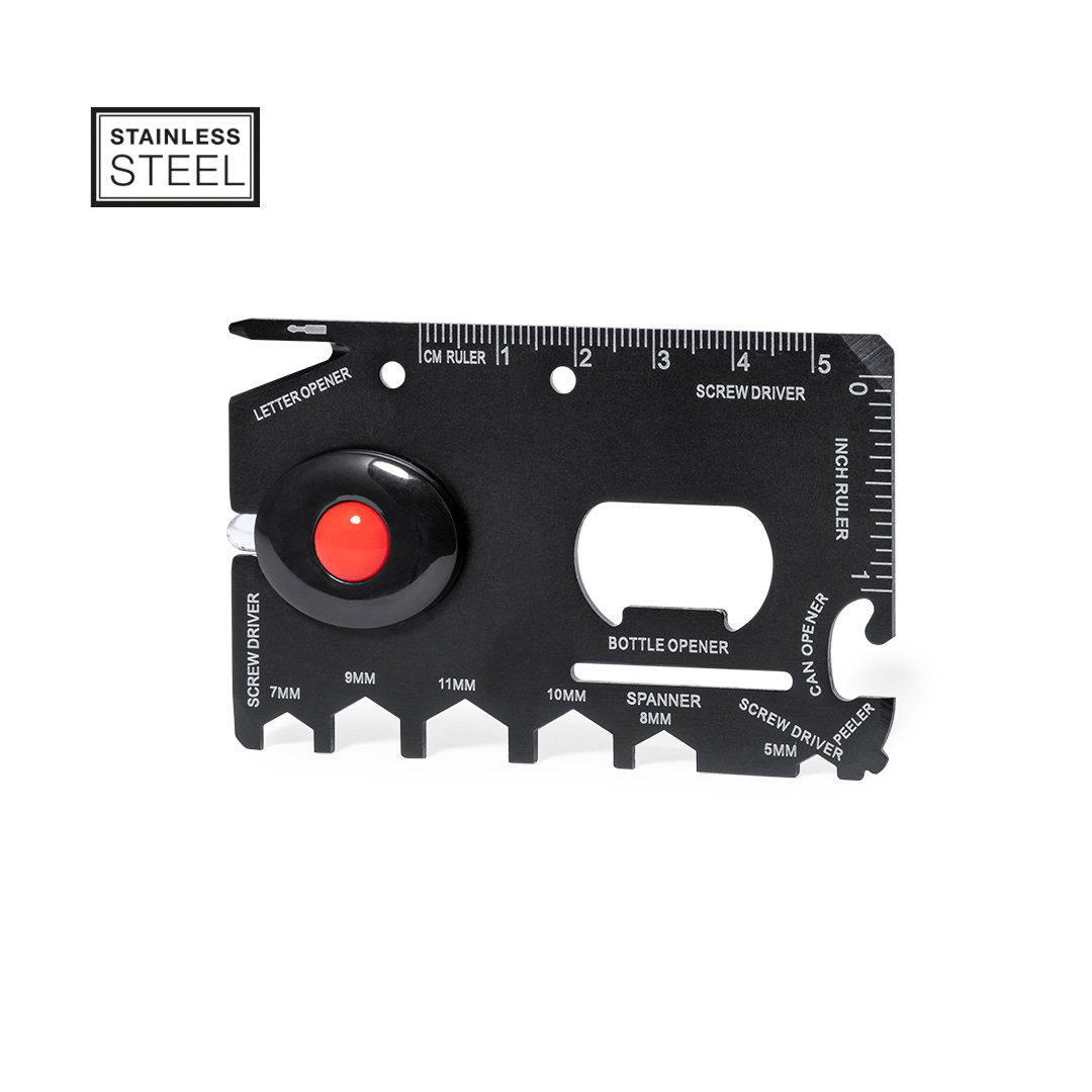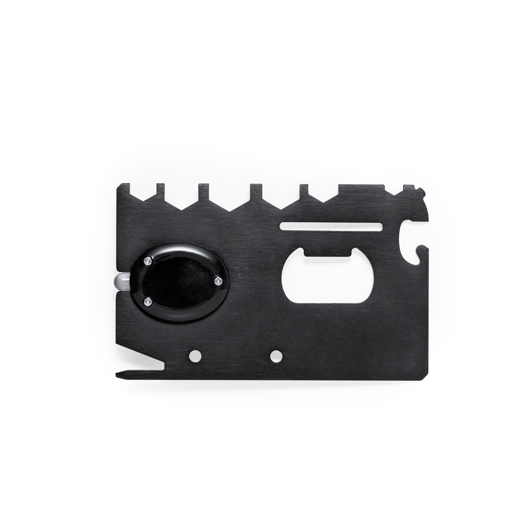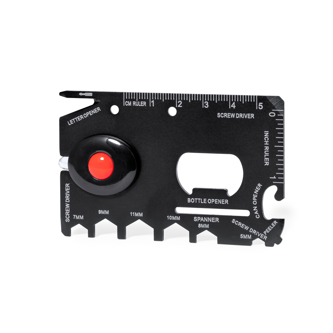 Handliches Multitool aus Edelstahl und schwarz lackiert. Flaches, kartenförmiges Design mit 16 Funktionen: Schlitzschraubendreher, Brieföffner, Lineal in cm und Zoll, Flaschenöffner, Dosenöffner, Schäler, Schraubenschlüssel für Sechskantmuttern in verschiedenen Größen und Taschenlampe (Knopfbatterie im Lieferumfang enthalten). Präsentiert in einer individuellen Tasche aus Recyclingpapier.
