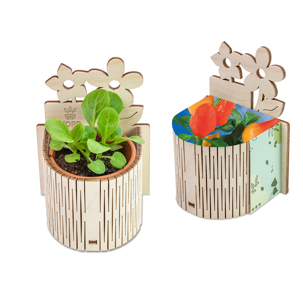 Der liebevoll gestaltete Tiny Garden ist ein natürlich schönes Highlight für jede Jahreszeit. Das kleine Tontöpfchen ist von einem filigranen Holzzäunchen eingefasst und wird durch eine Rückwand aus Holz mit zarter Blümchenkontur ergänzt – ideal für eine gelaserte Werbebotschaft oder ein Logo. Gefüllt mit einer Substrattablette als Erde und Samen nach Wahl entsteht daraus ein charmantes Mini-Gartenprojekt. Die individuell bedruckte Banderole aus Papier verschließt das Set und rundet das Produkt harmonisch ab – ein sympathisches Giveaway, das Natürlichkeit und Werbewirkung perfekt verbindet.