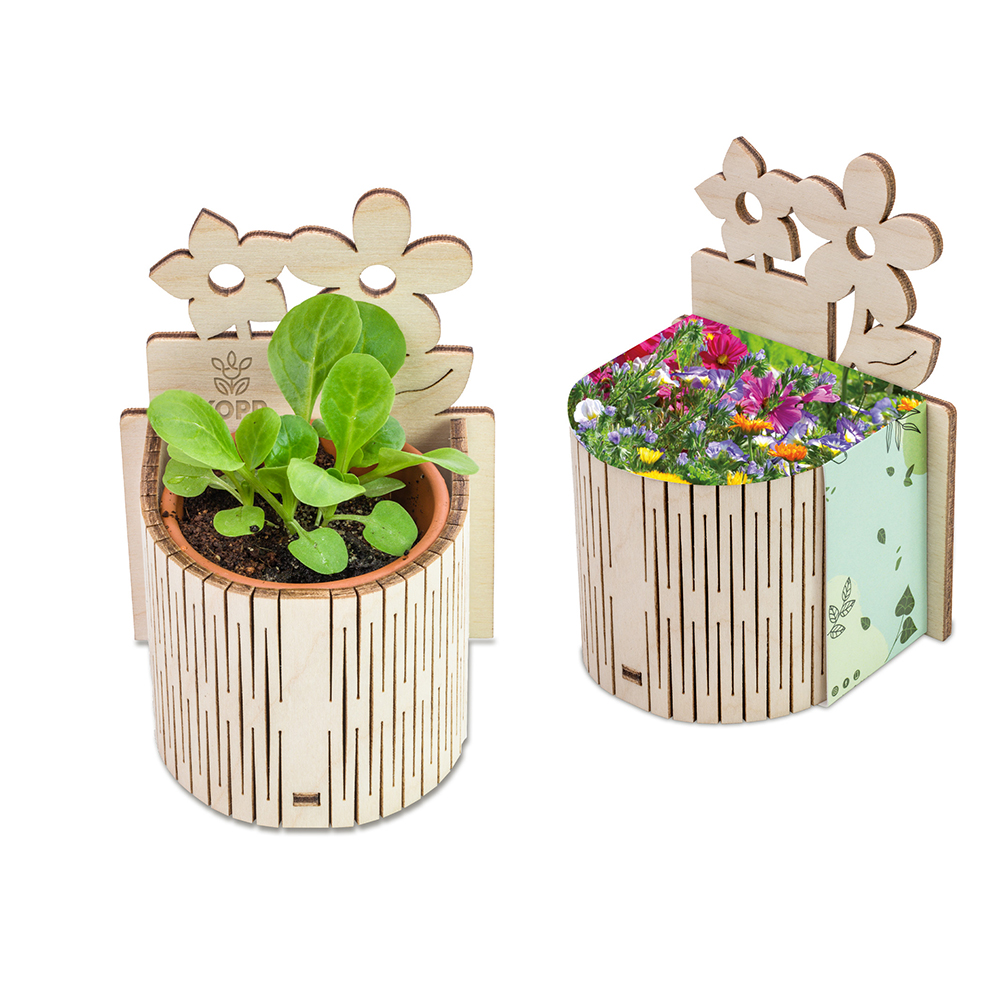 Der liebevoll gestaltete Tiny Garden ist ein natürlich schönes Highlight für jede Jahreszeit. Das kleine Tontöpfchen ist von einem filigranen Holzzäunchen eingefasst und wird durch eine Rückwand aus Holz mit zarter Blümchenkontur ergänzt – ideal für eine gelaserte Werbebotschaft oder ein Logo. Gefüllt mit einer Substrattablette als Erde und Samen nach Wahl entsteht daraus ein charmantes Mini-Gartenprojekt. Die individuell bedruckte Banderole aus Papier verschließt das Set und rundet das Produkt harmonisch ab – ein sympathisches Giveaway, das Natürlichkeit und Werbewirkung perfekt verbindet.