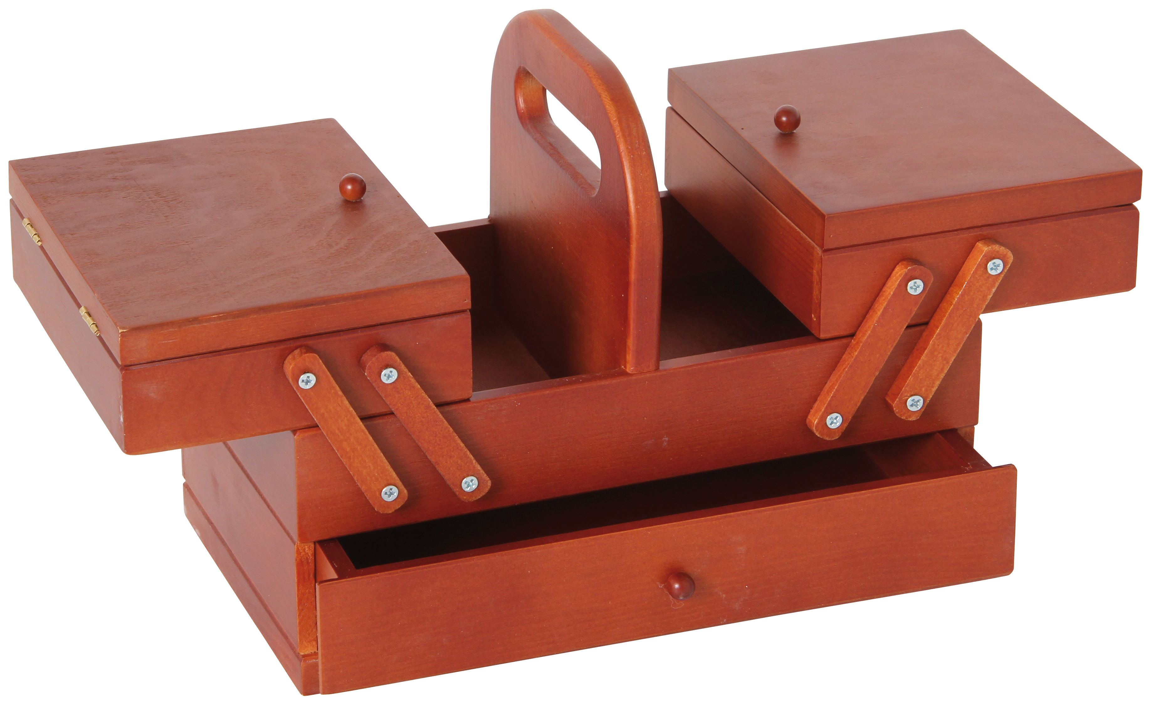 Aus Holz, mitTragegriff, geräumigen Fächern und Schublade.