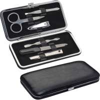 Maniküre Set (5teilig) bestehend aus einer Nagelfeile, einer Nagelschere, einer Nagelzange, einer Pinzette und einem Nagelhautschieber. Geliefert in einem Etui aus PU. 110 x 65 x 20 mm