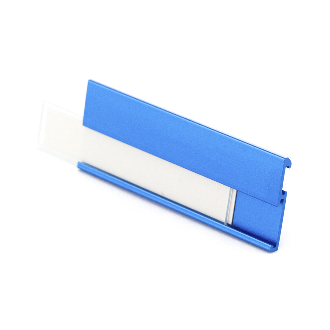 Aluminium-Namensschild in lebendigen Farben mit Befestigungsnadel auf der Rückseite.