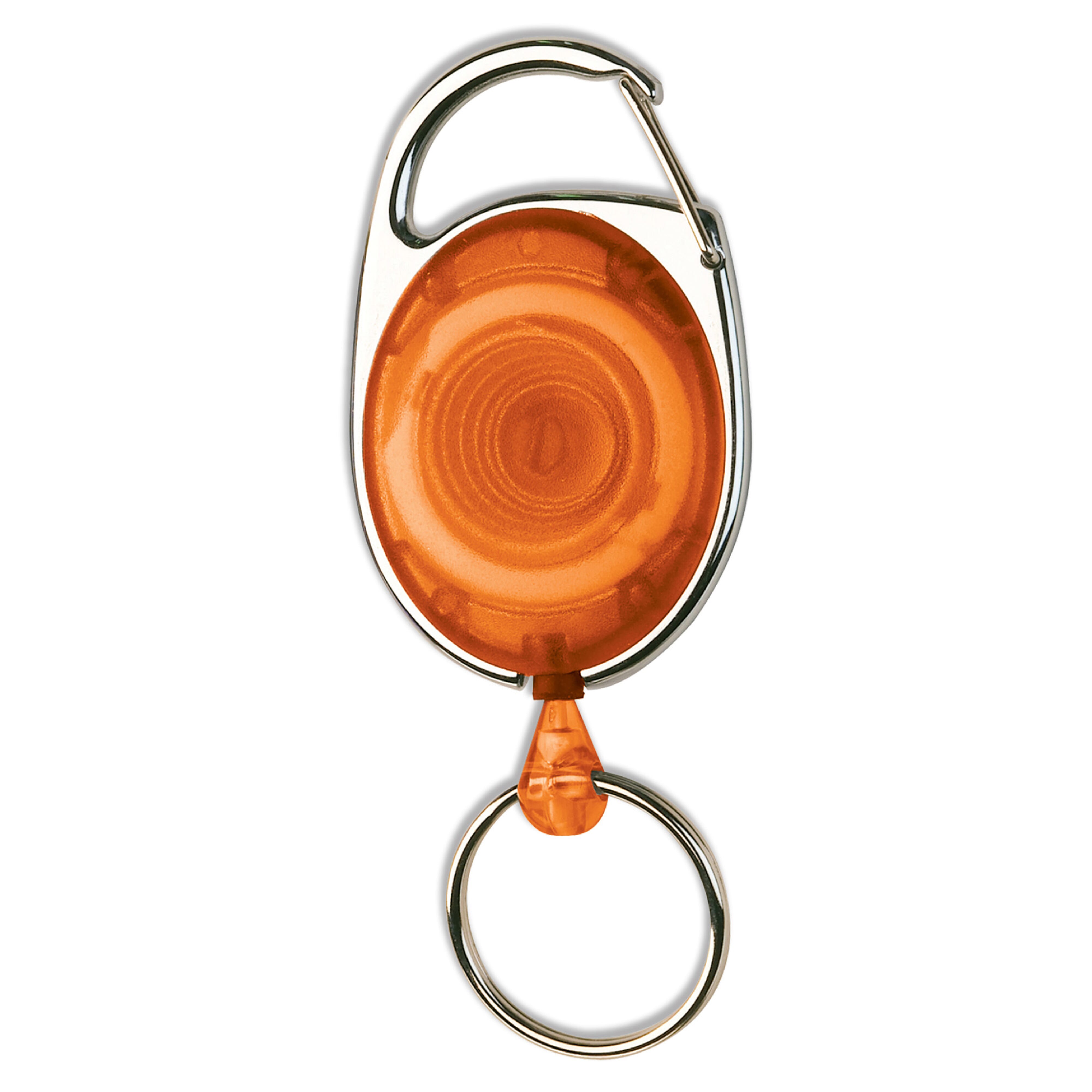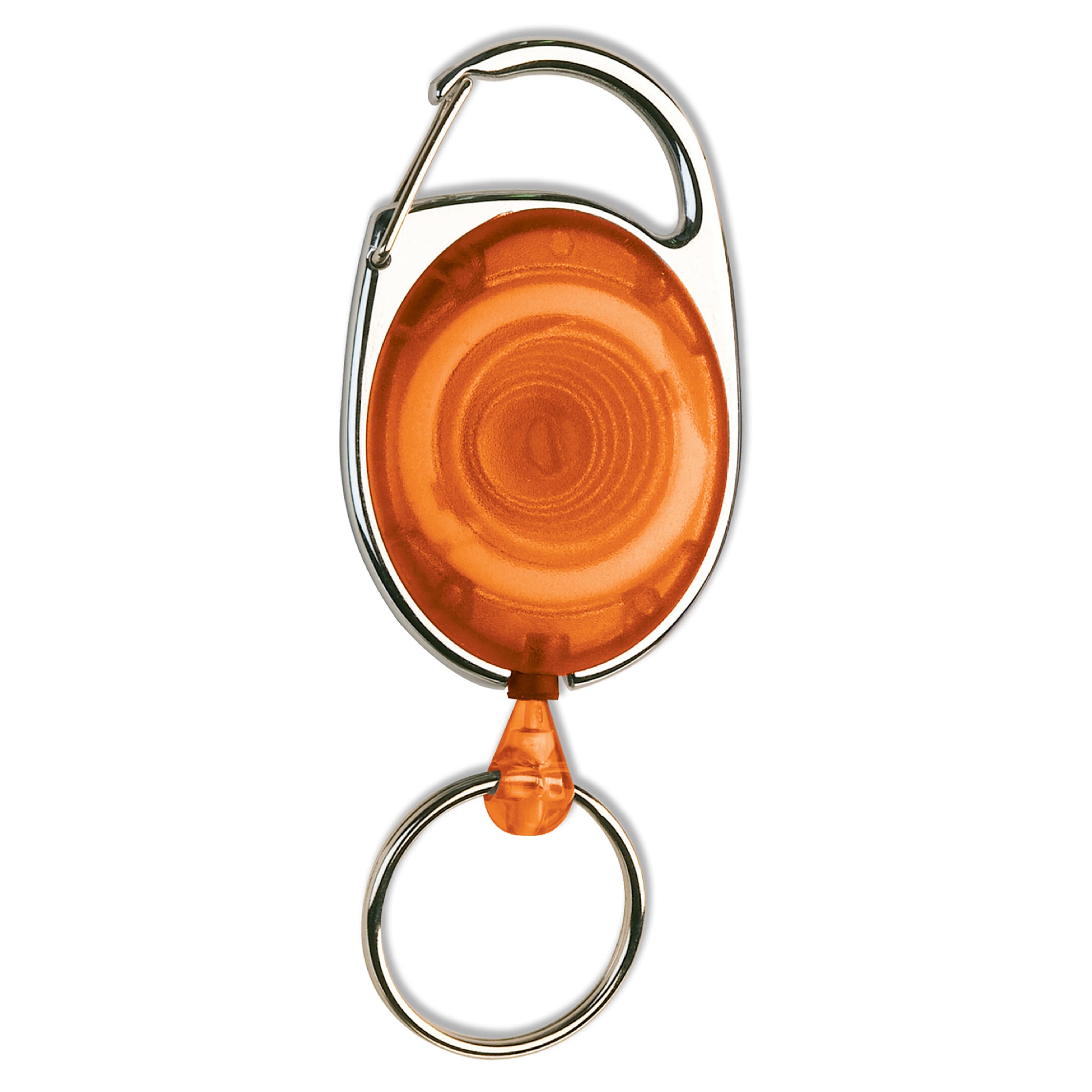 Gefrosteter Namensschildhalter mit Ausziehband (60cm) und Karabinerhaken.