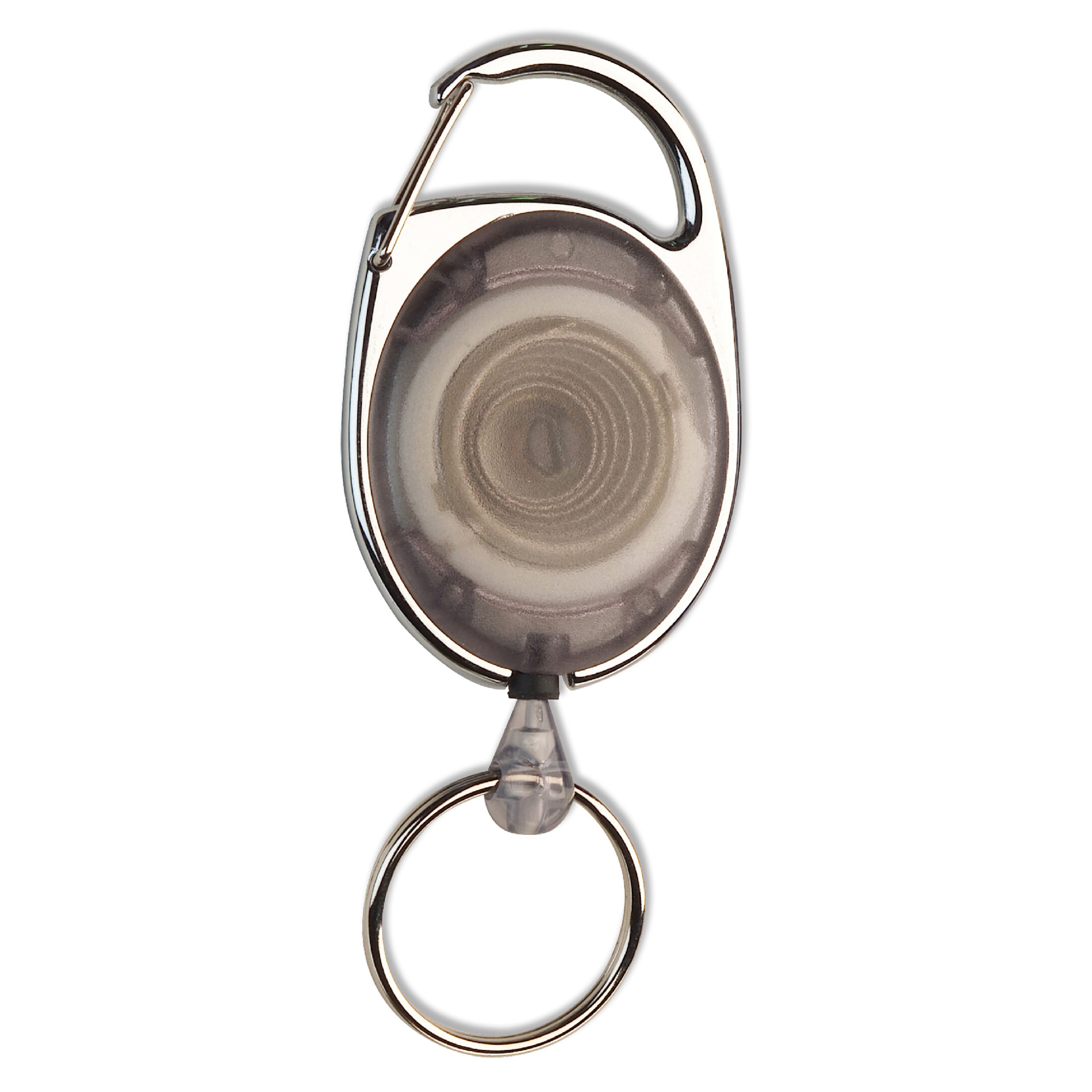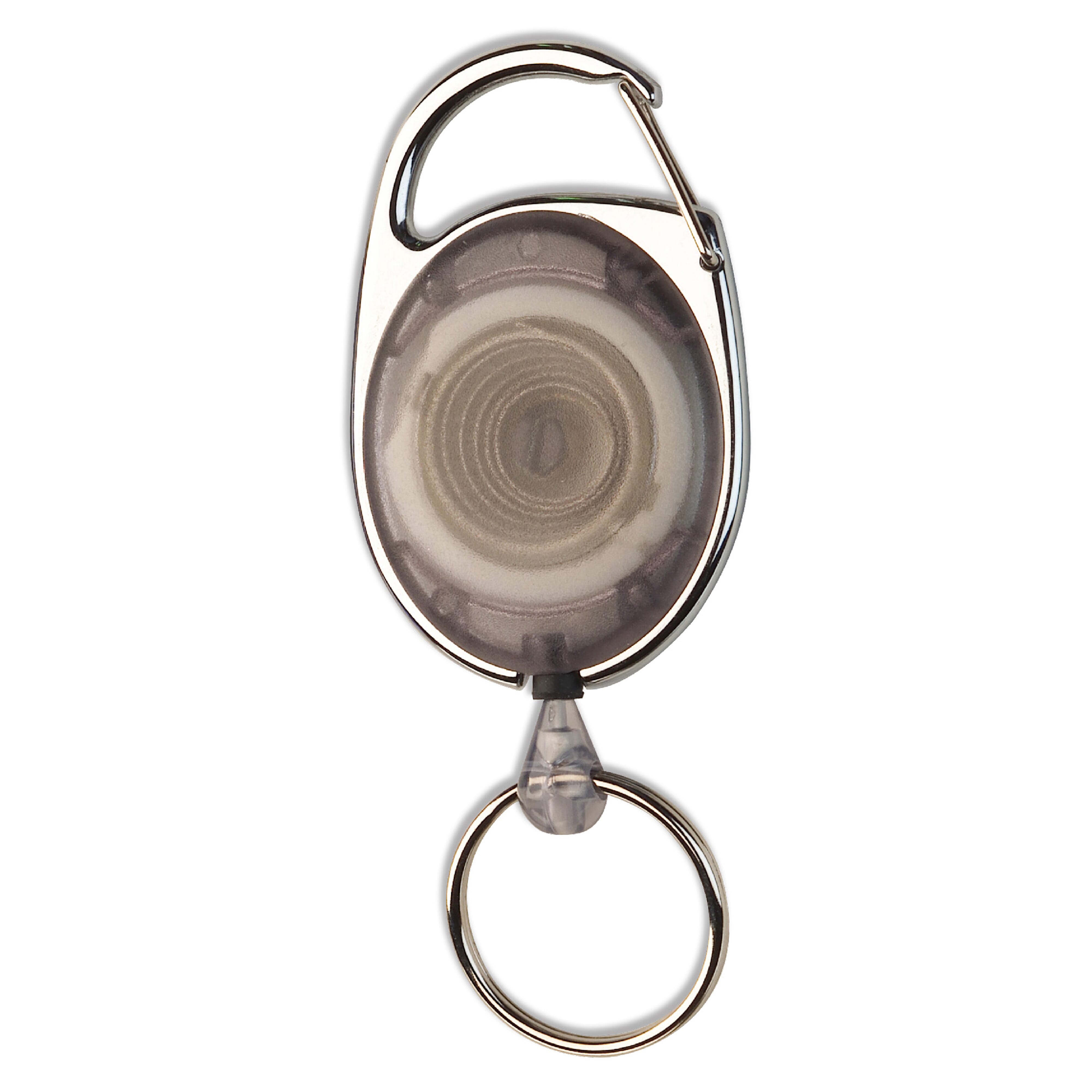 Gefrosteter Namensschildhalter mit Ausziehband (60cm) und Karabinerhaken.