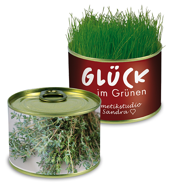 Geliefert wird die Weißblech-Dose mit einer Auswahl an Samen und einer Substrattablette als Erde. Einfach Deckelöffnen, gießen und die Natur live erleben. Die Werbebanderole bietet viel Platz für Ihre individuelle Werbebotschaft und verleiht der Dose einen einmaligen Charakter.