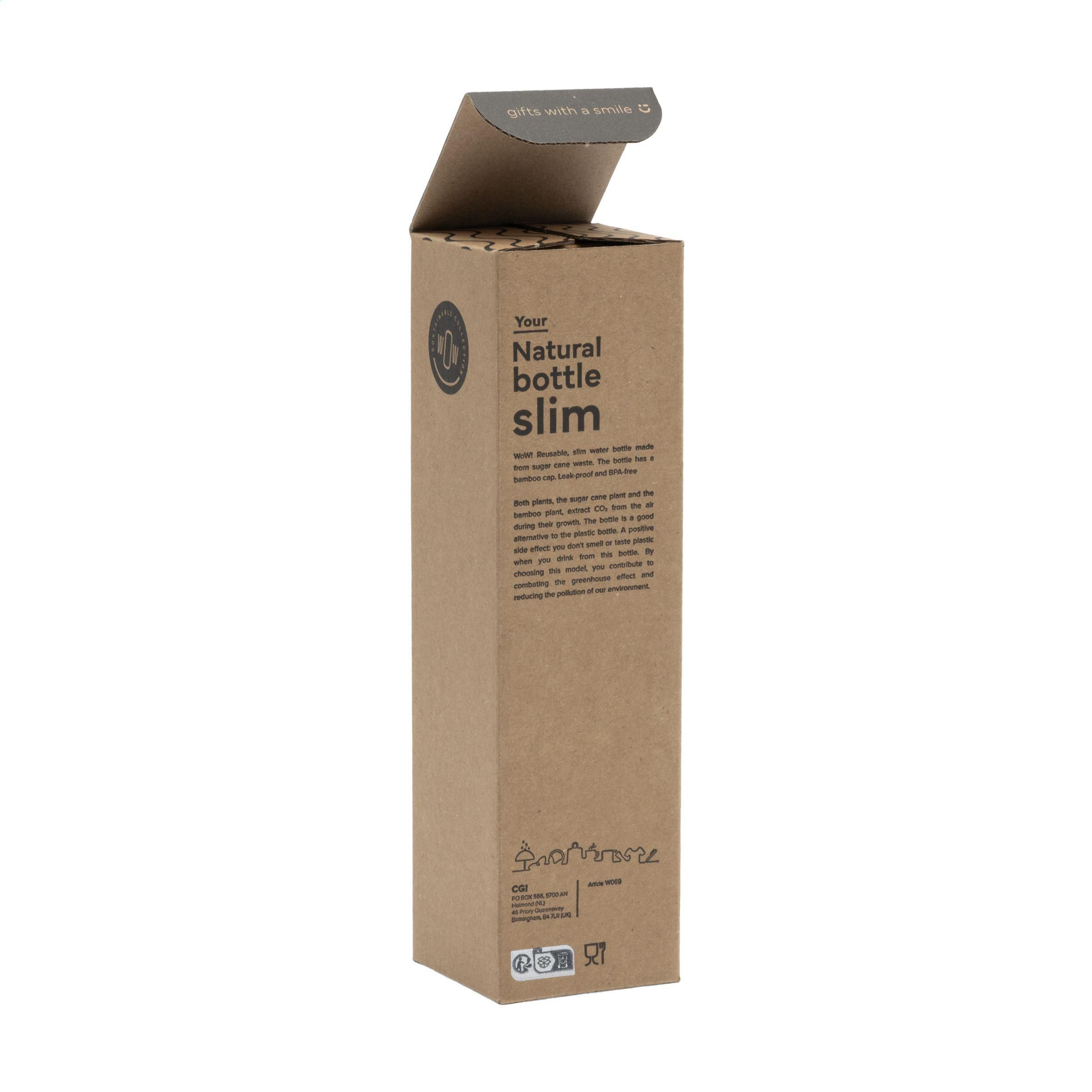 iederverwendbare, schlanke Wasserflasche aus Zuckerrohrabfällen. Die Flasche hat einen Bambusverschluss. Auslaufsicher. Beide Pflanzen, die Zuckerrohrpflanze und die Bambuspflanze, entziehen der Luft während ihres Wachstums CO2. Die Flasche ist eine gute Alternative zur Plastikflasche. Nicht spülmaschinengeeignet. Hergestellt in Europa. Fassungsvermögen 500 ml.