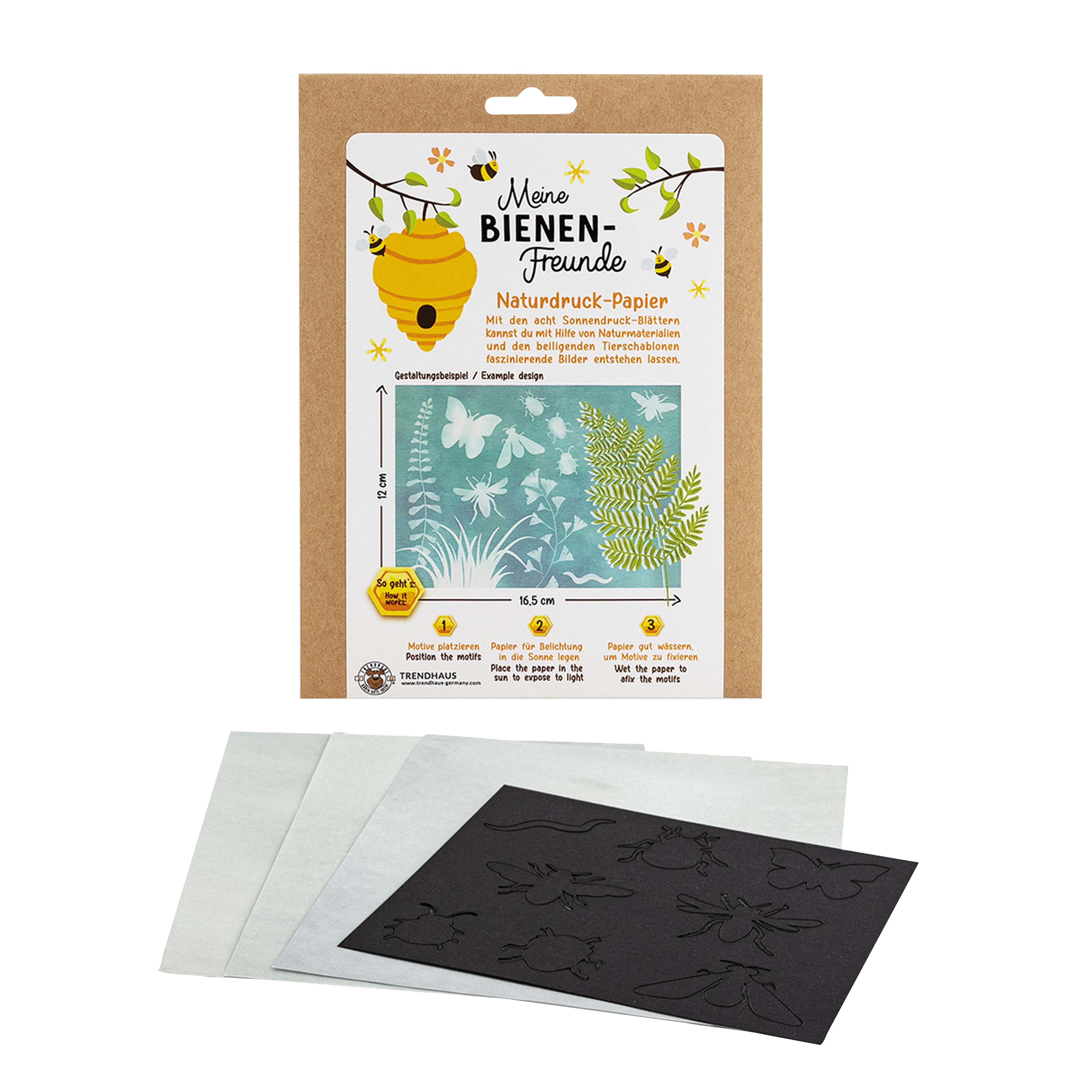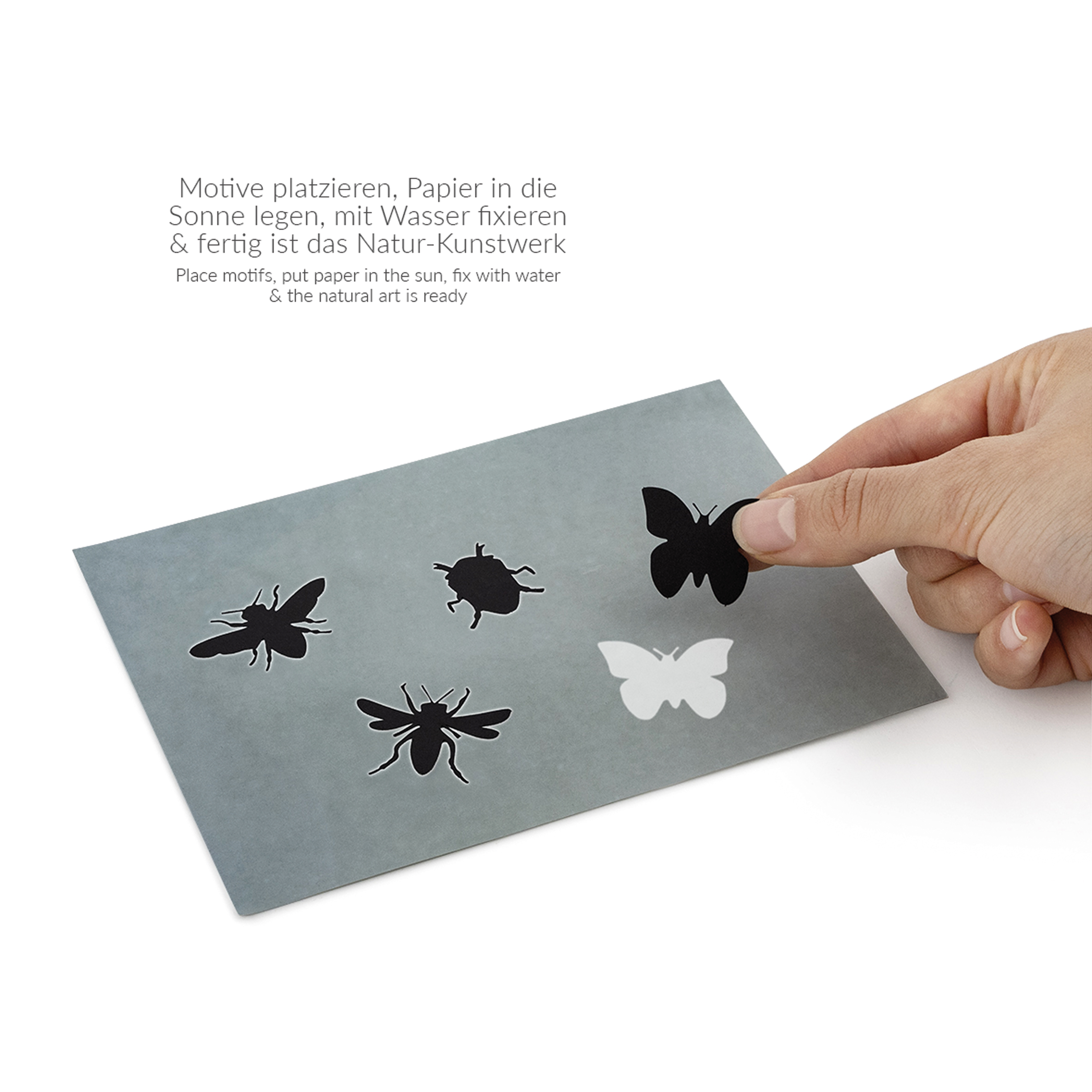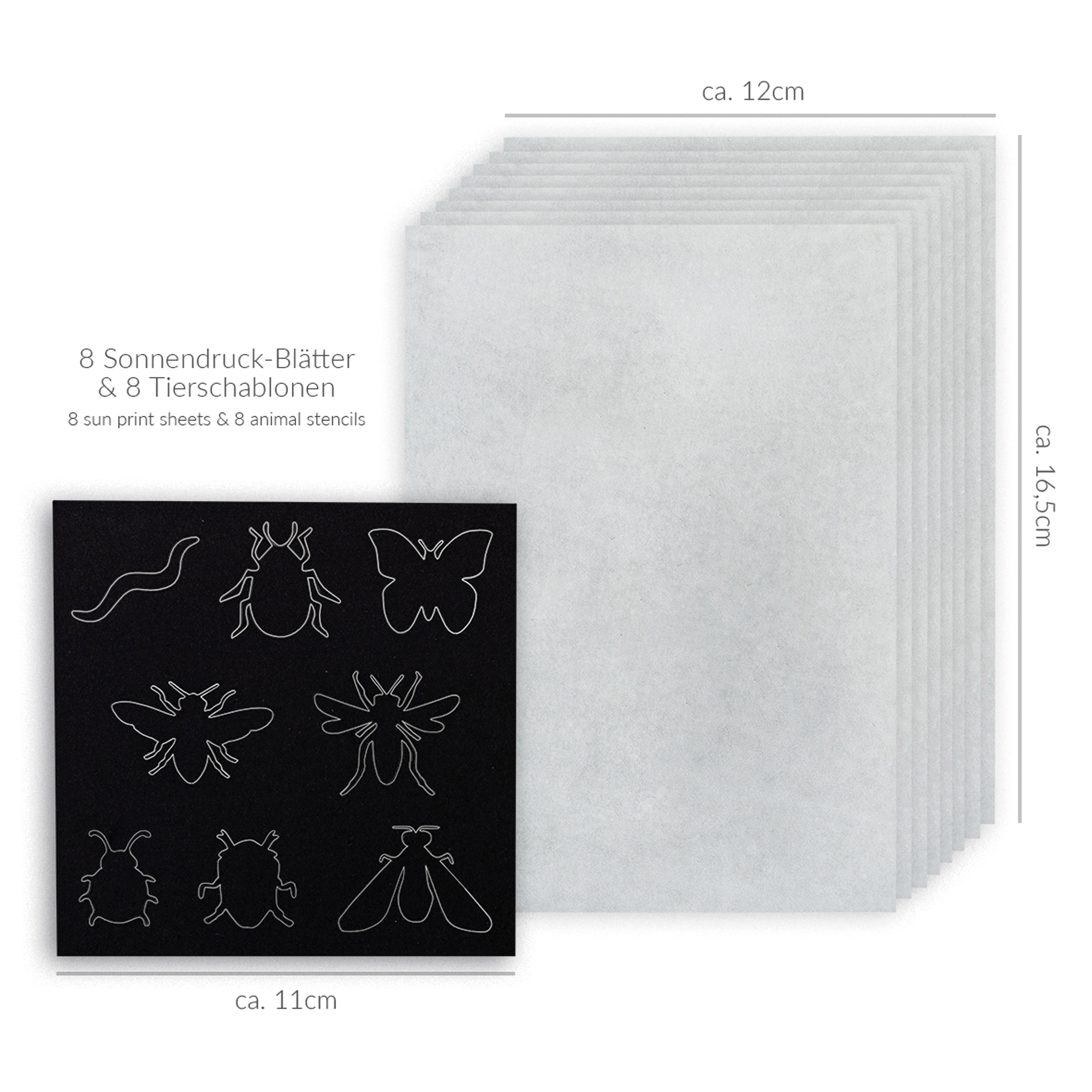 Perfekt für kreative und naturbegeisterte Künstler! Mit diesen acht Sonnendruck-Blättern kannst du mit Hilfe von Naturmaterialien und den beiliegenden Tierschablonen faszinierende Bilder entstehen lassen. Lege einfach deine gewünschten Materialien wie gesammelte Gräser, Blätter oder Blüten zusammen mit den Tierbildern aus der Schablone auf das Naturdruck-Papier und lege es anschließend für die Belichtung in die Sonne. Tauche es dann kurz in klares Wasser um die Motive zu fixieren. So entsteht ein einzigartiges Kunstwerk mit Hilfe der Sonnenkraft! Inhalt: 8 Naturdruck-Papiere (ca. 12 x 16,5 cm), Schablone mit 8 verschiedenen Tiermotiven.