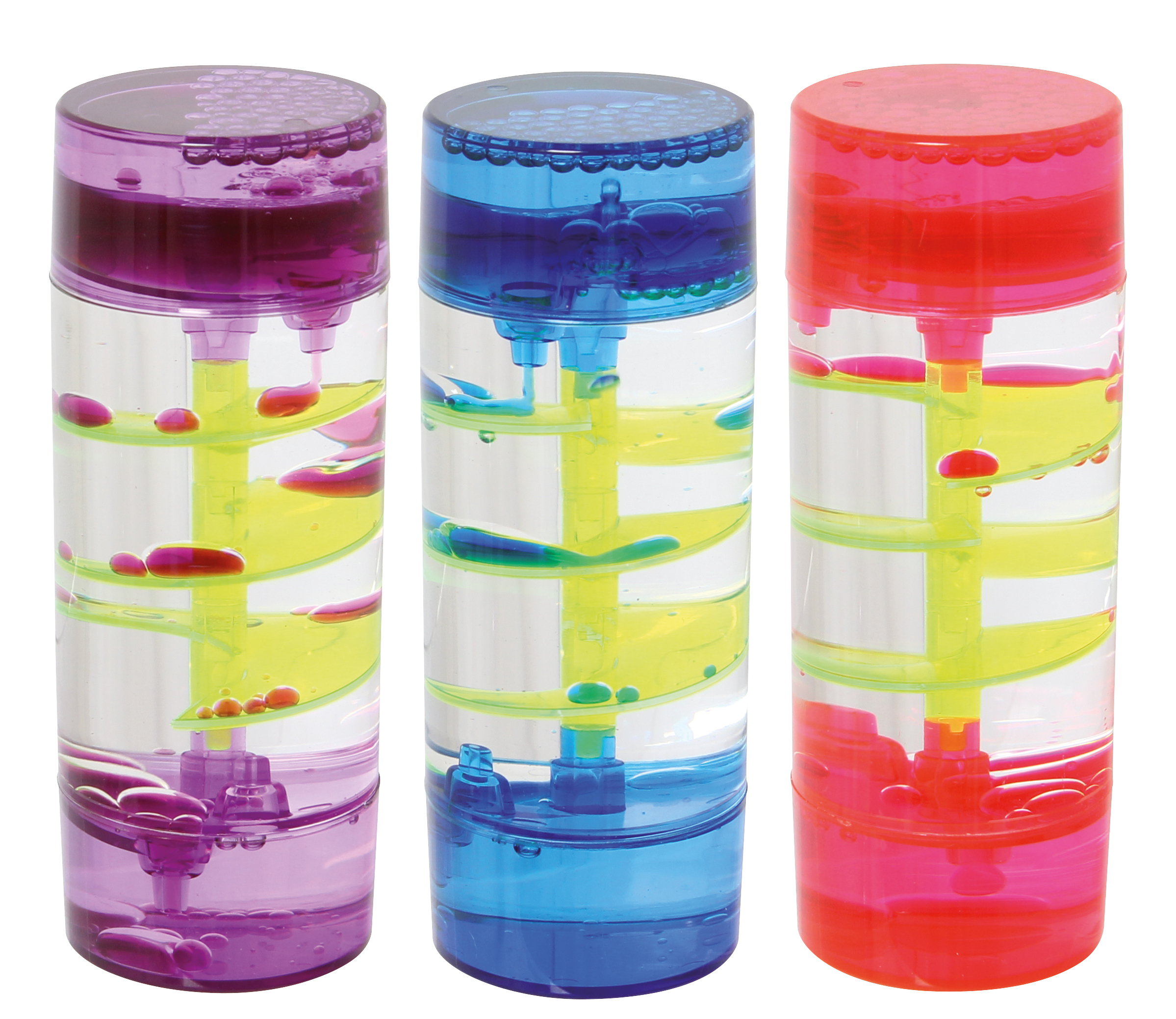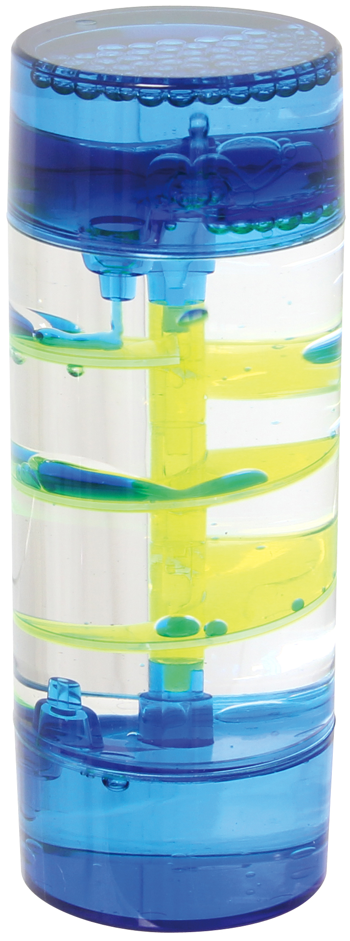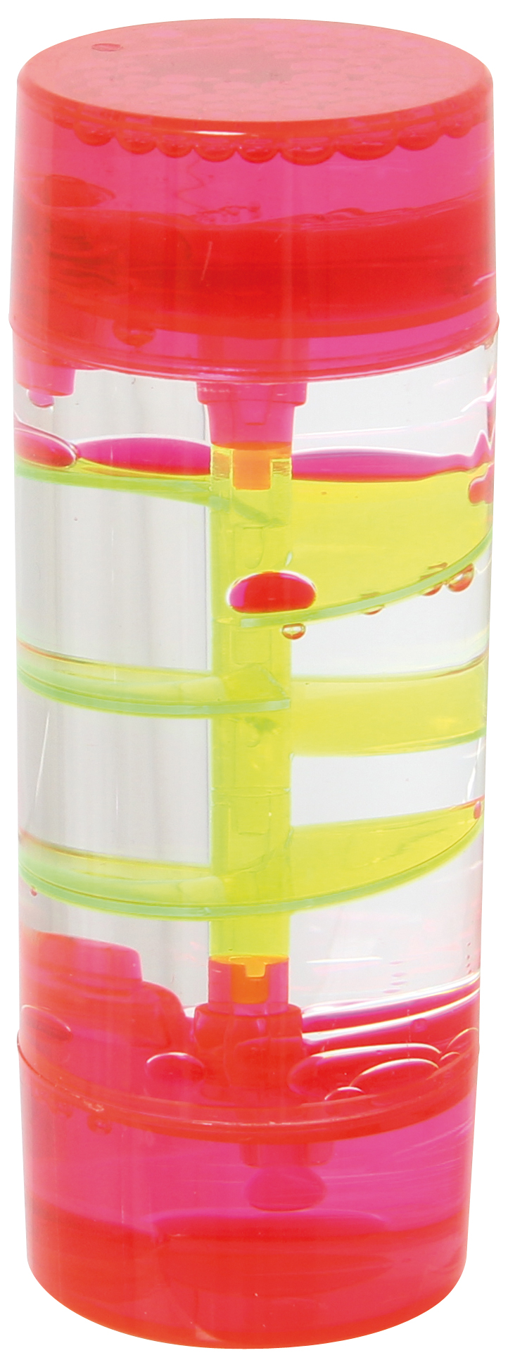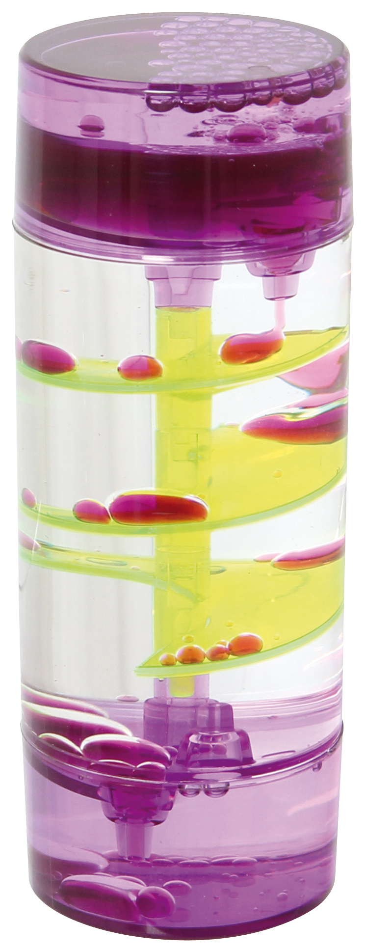 Aus Kunststoff. Drei Farben sortiert. Eine farbige Flüssigkeit läuft blubbernd die Wendeltreppe im Innern nach unten.