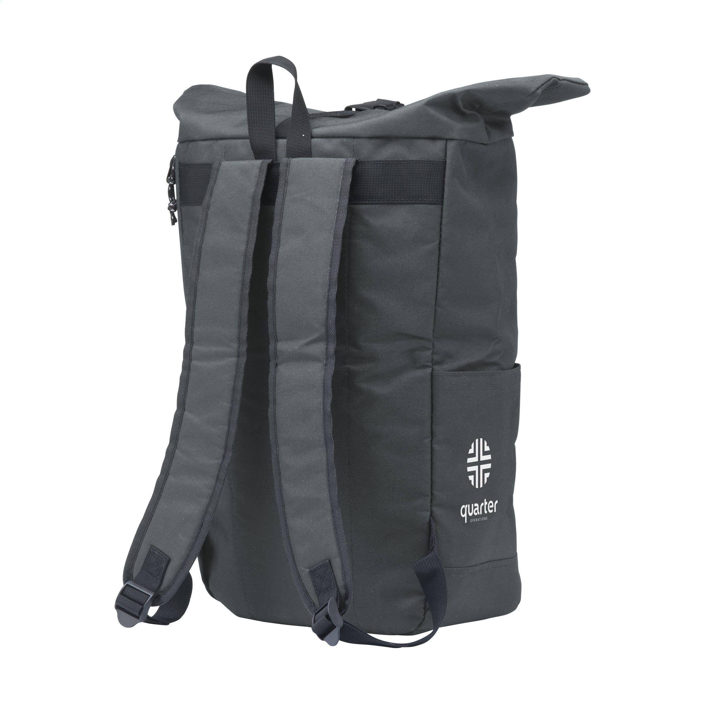 Praktischer, robuster und wasserabweisender „Roll-Top“-Kühlrucksack aus RPET-Polyester. Der Rucksack verfügt über eine große Innentasche mit speziellem Kühlfach. Das Kühlfach ist schnell zugänglich – durch die Oberseite der Tasche oder durch einen praktischen und wasserdichten Reißverschluss auf der Rückseite. Die ideale Tasche für Outdoor-Aktivitäten, Picknicks und Lebensmittellieferungen. Inklusive Reißverschlusstasche vorne, 2 Seitentaschen, Schaumstoffrücken mit gepolsterten, verstellbaren Schultergurten, Trageschlaufe und praktischem Reißverschluss. Fassungsvermögen ca. 30 Liter.