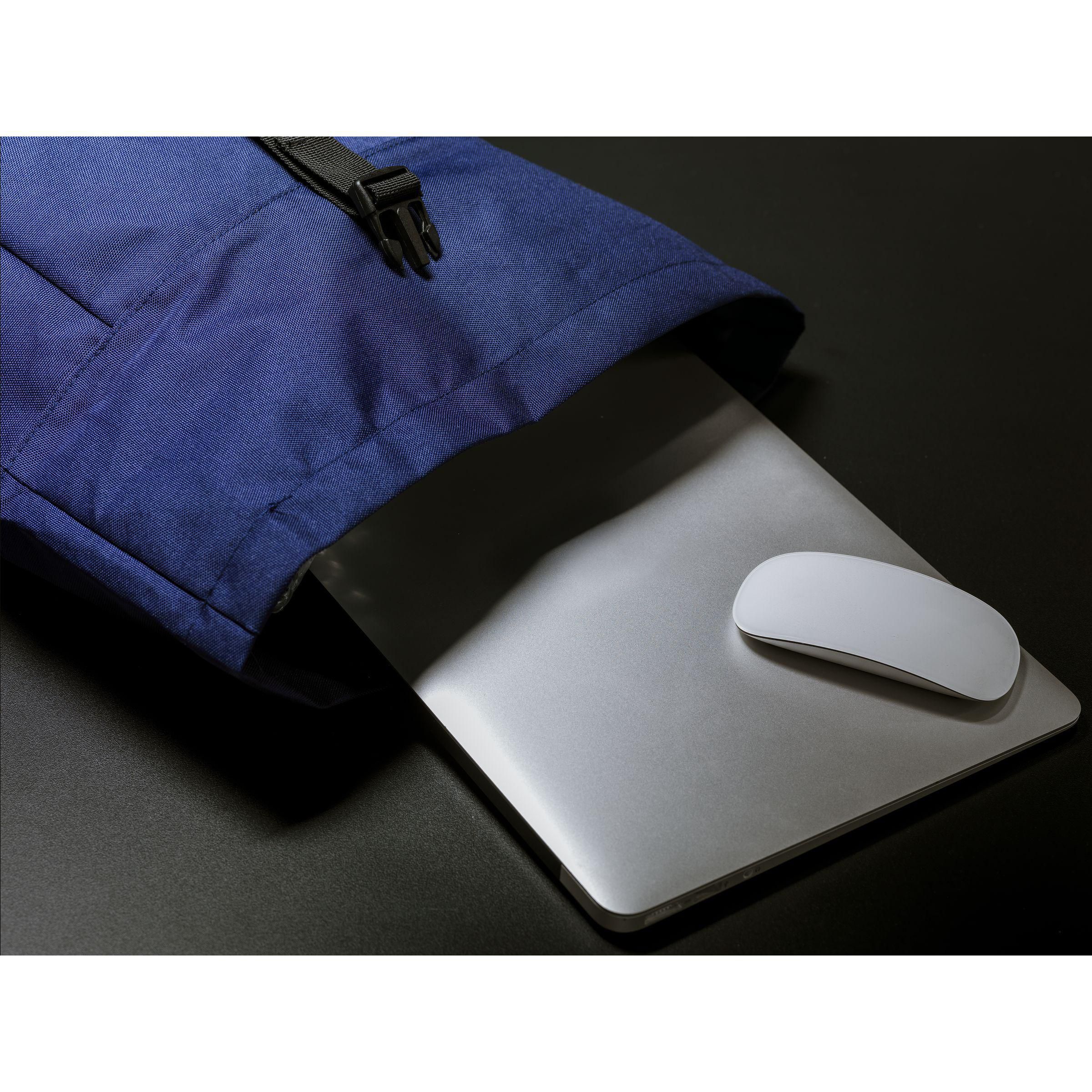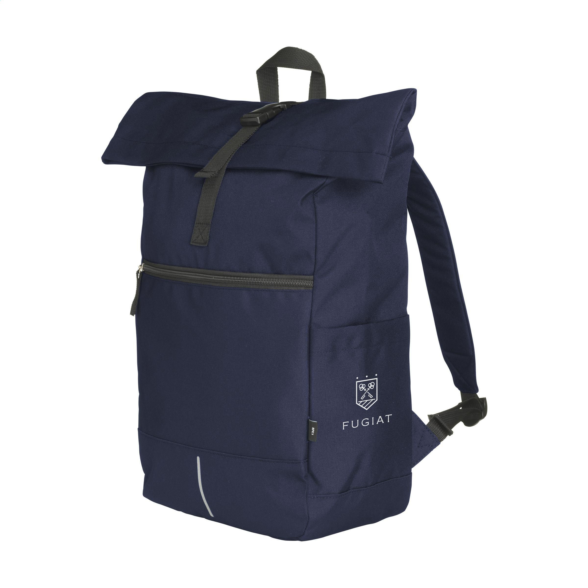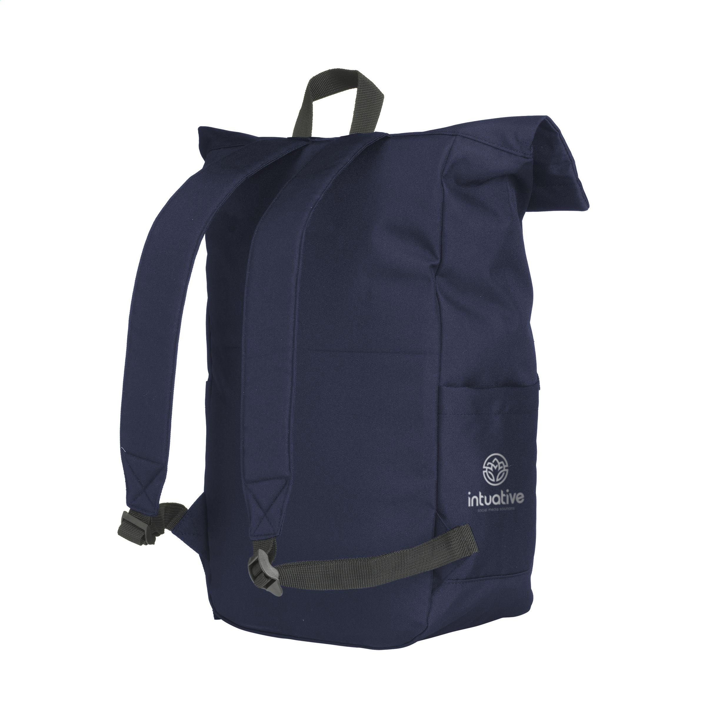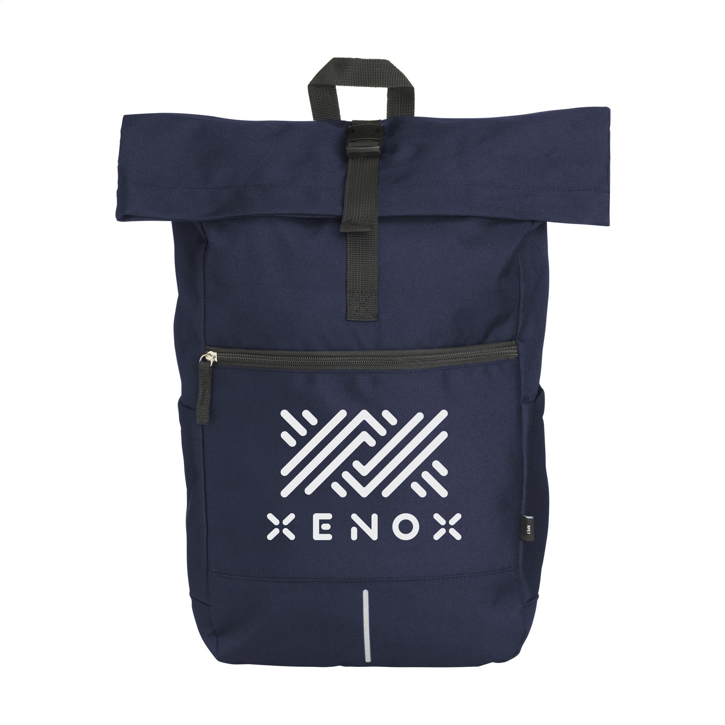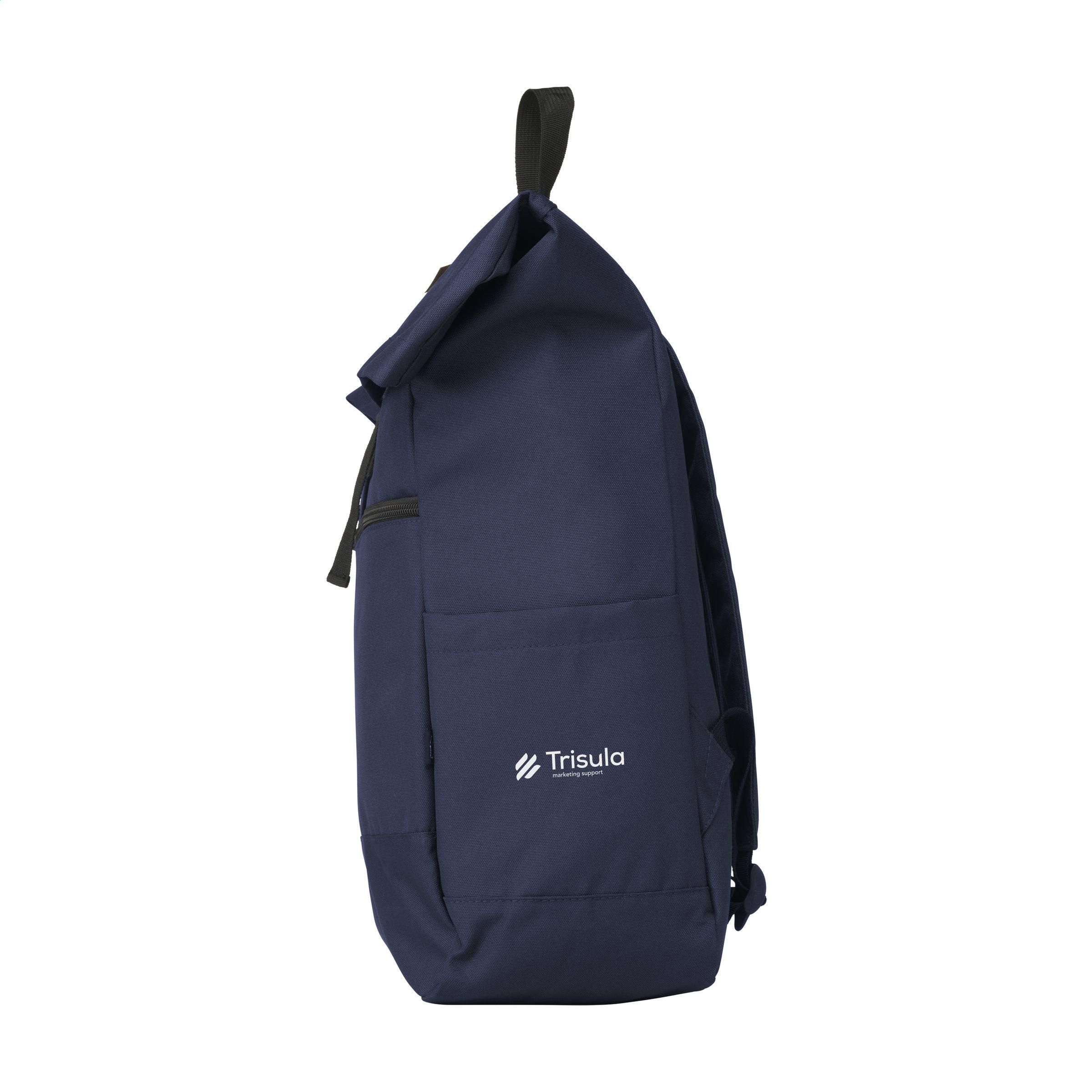 Praktischer, robuster und wasserabweisender „Roll-Top“-Rucksack aus RPET-Polyester. Der Rucksack hat ein großes Innenfach mit speziellem Laptopfach (bis zu 15,6 Zoll). Reißverschlusstasche auf der Vorderseite mit einem reflektierenden Akzent darunter (was die Sichtbarkeit im Dunkeln verbessert). Mit 2 Seitentaschen, Schaumrücken und gepolsterten, verstellbaren Schultergurten für mehr Tragekomfort, Trageschlaufe und Rollverschluss mit praktischem Klicksystem oben. Die perfekte Tasche für den täglichen Gebrauch. Gesamtes recyceltes Material: 51%. Fassungsvermögen: ca. 20 Liter.