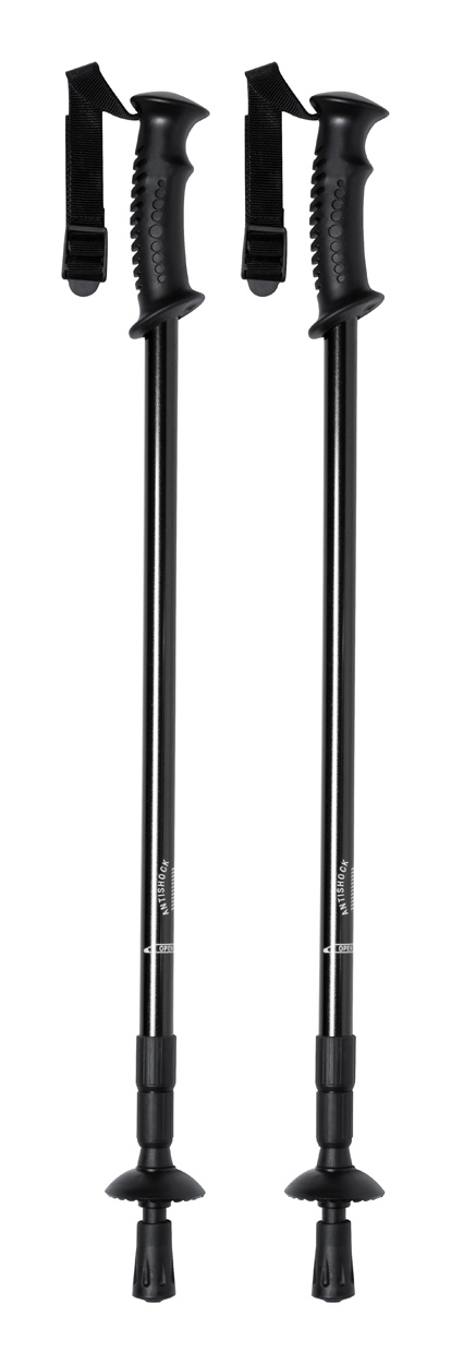2-tlg. Nordic-Walking-Set mit Aluminium-Stöcken, ergonomischen Griffen, Handgelenkschlaufen und Anti-Shock-System. Verpackt in einer Tragetasche zusammen mit den Schnee-Aufsätzen.
