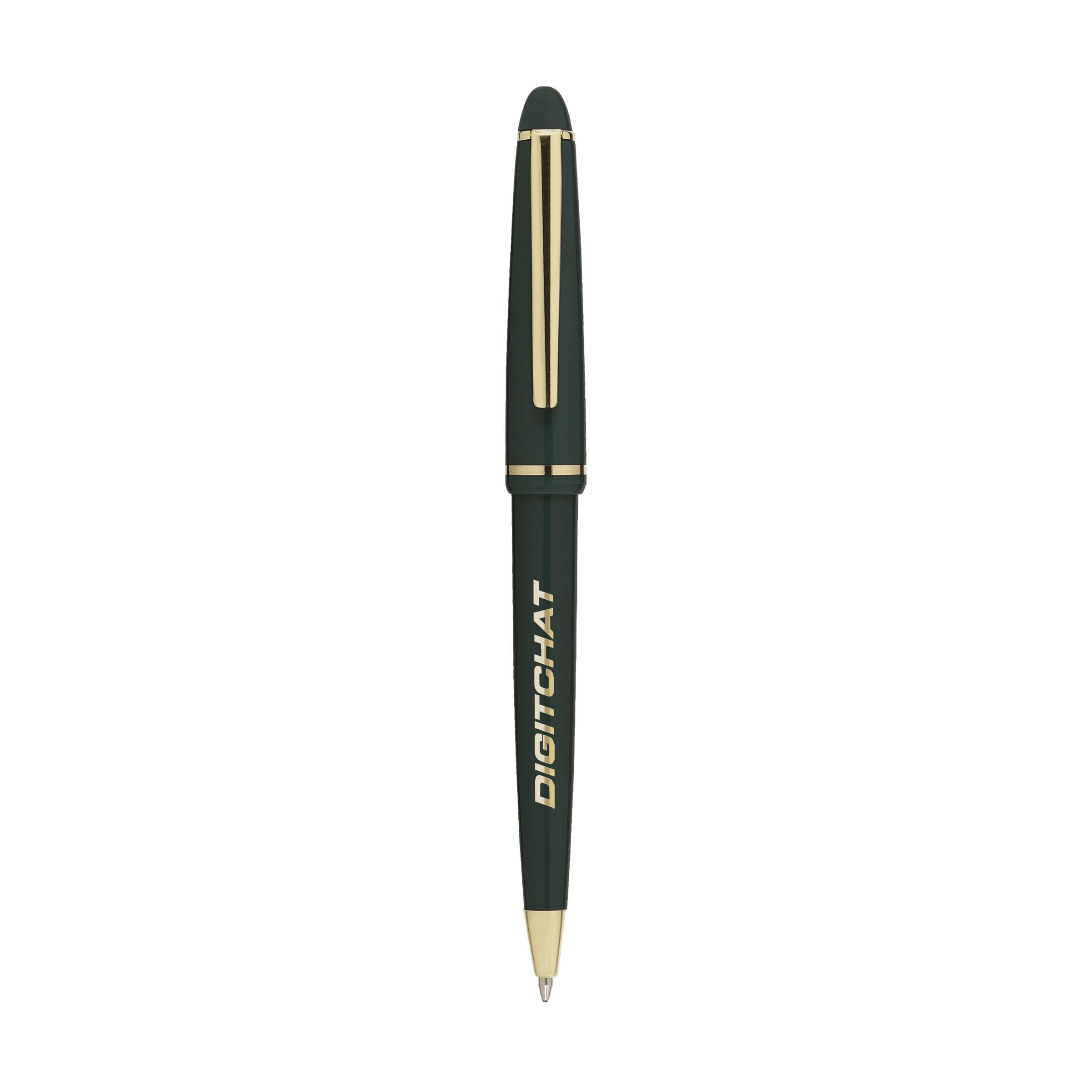 Beschreibung: Blauschreibender Kugelschreiber mit poliertem Gehäuse, vergoldetem, zierlichem Clip und Spitze und Druckkappensystem.