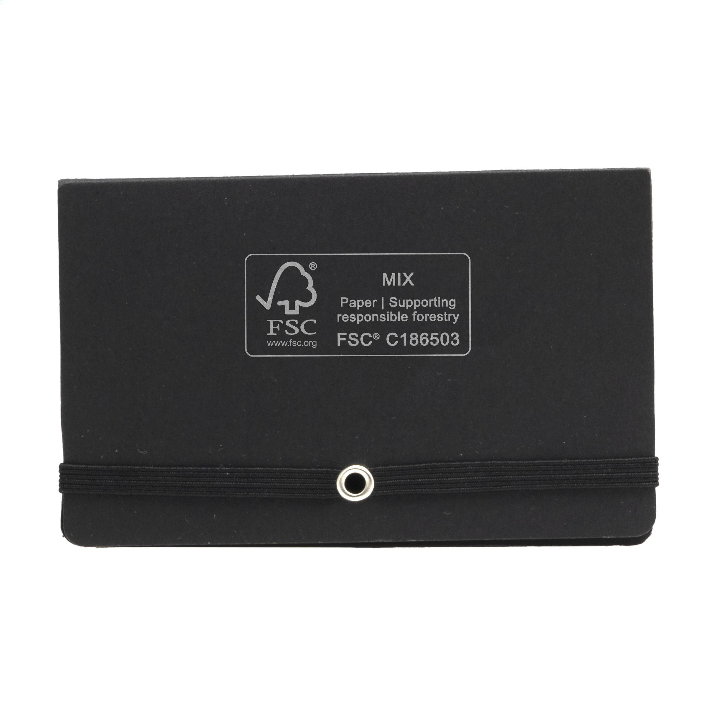 Memobuch mit 25 Haftzetteln, 125 beschreibbaren Markierstickern, Visitenkartenhalter und elastischem Verschluss.