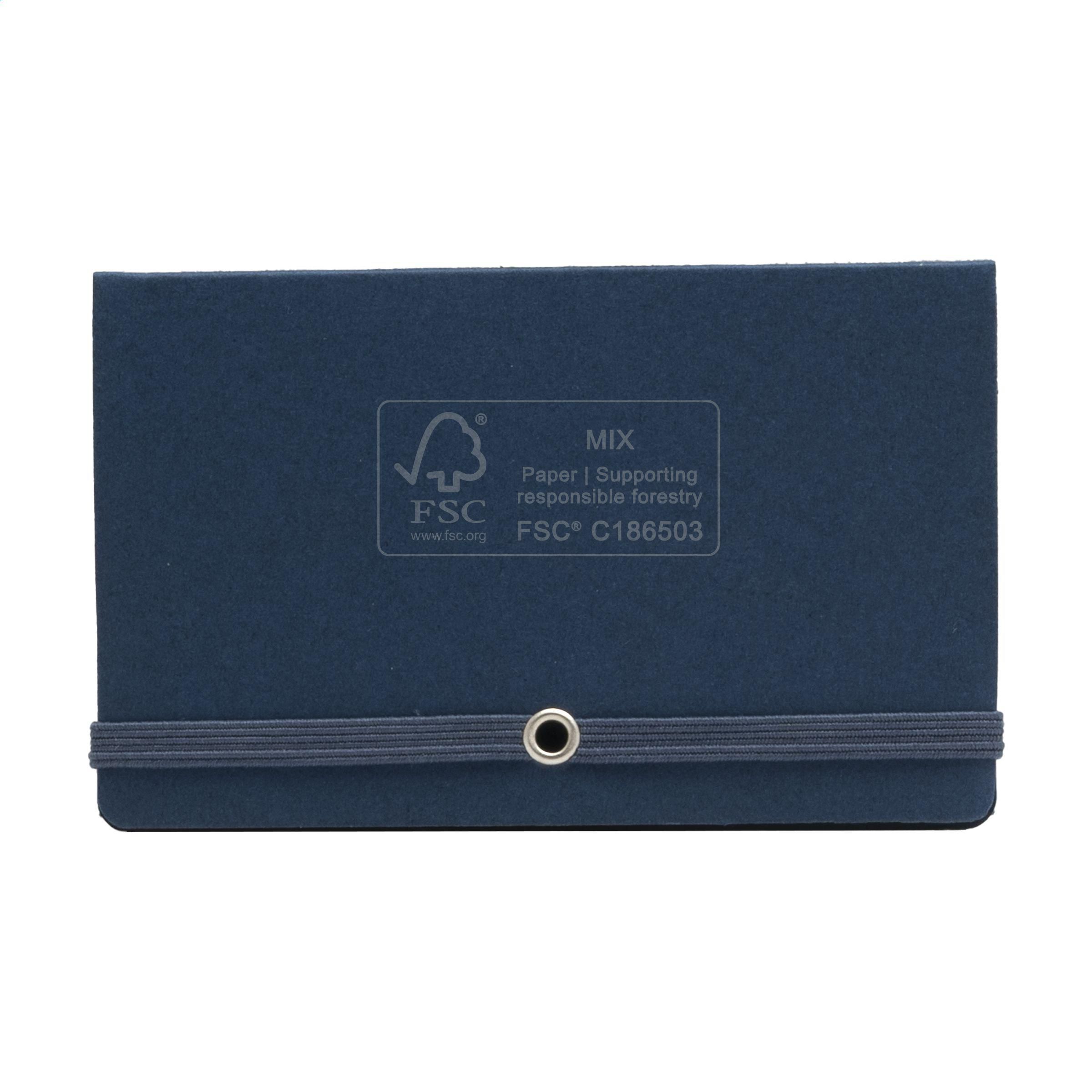 Memobuch mit 25 Haftzetteln, 125 beschreibbaren Markierstickern, Visitenkartenhalter und elastischem Verschluss.