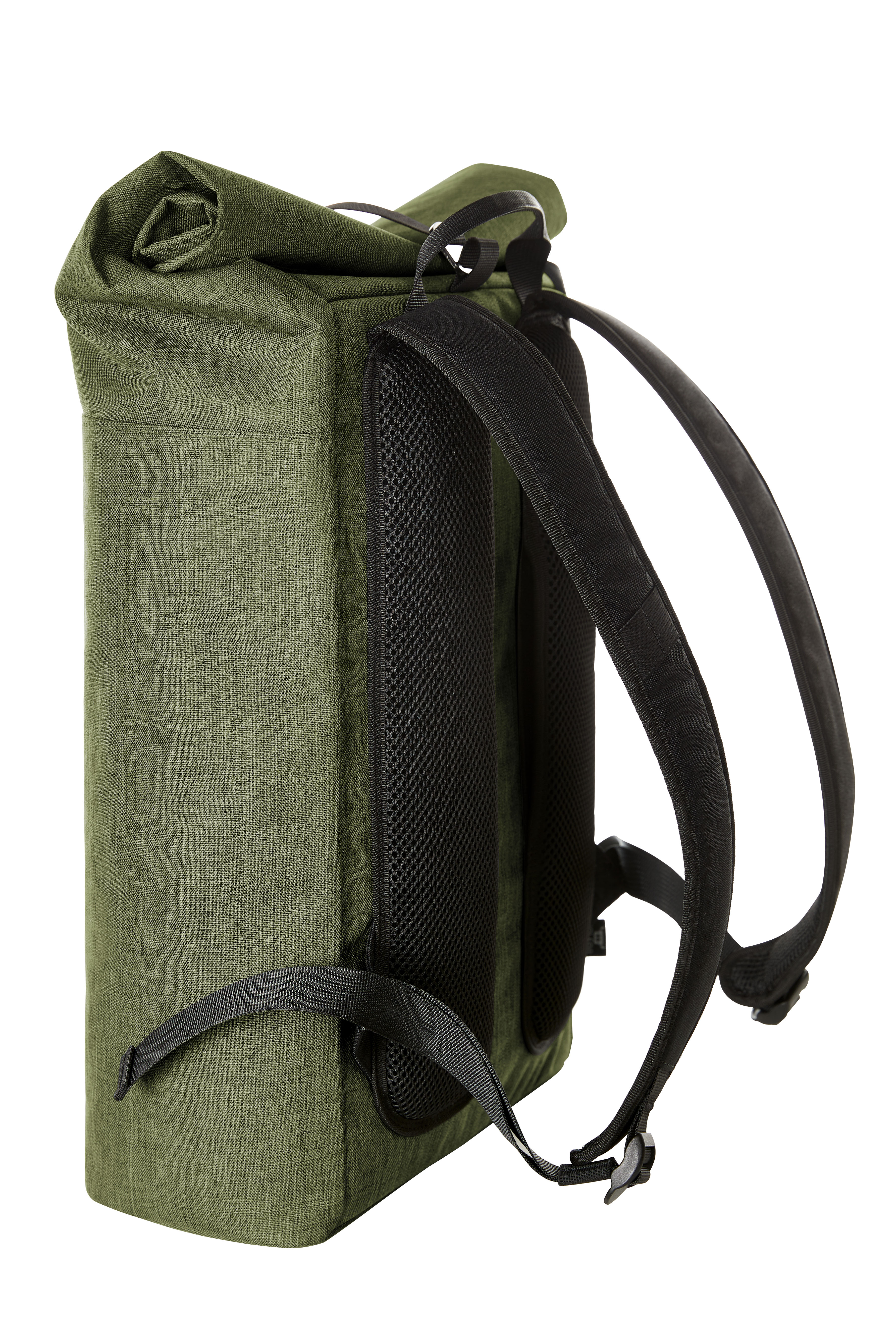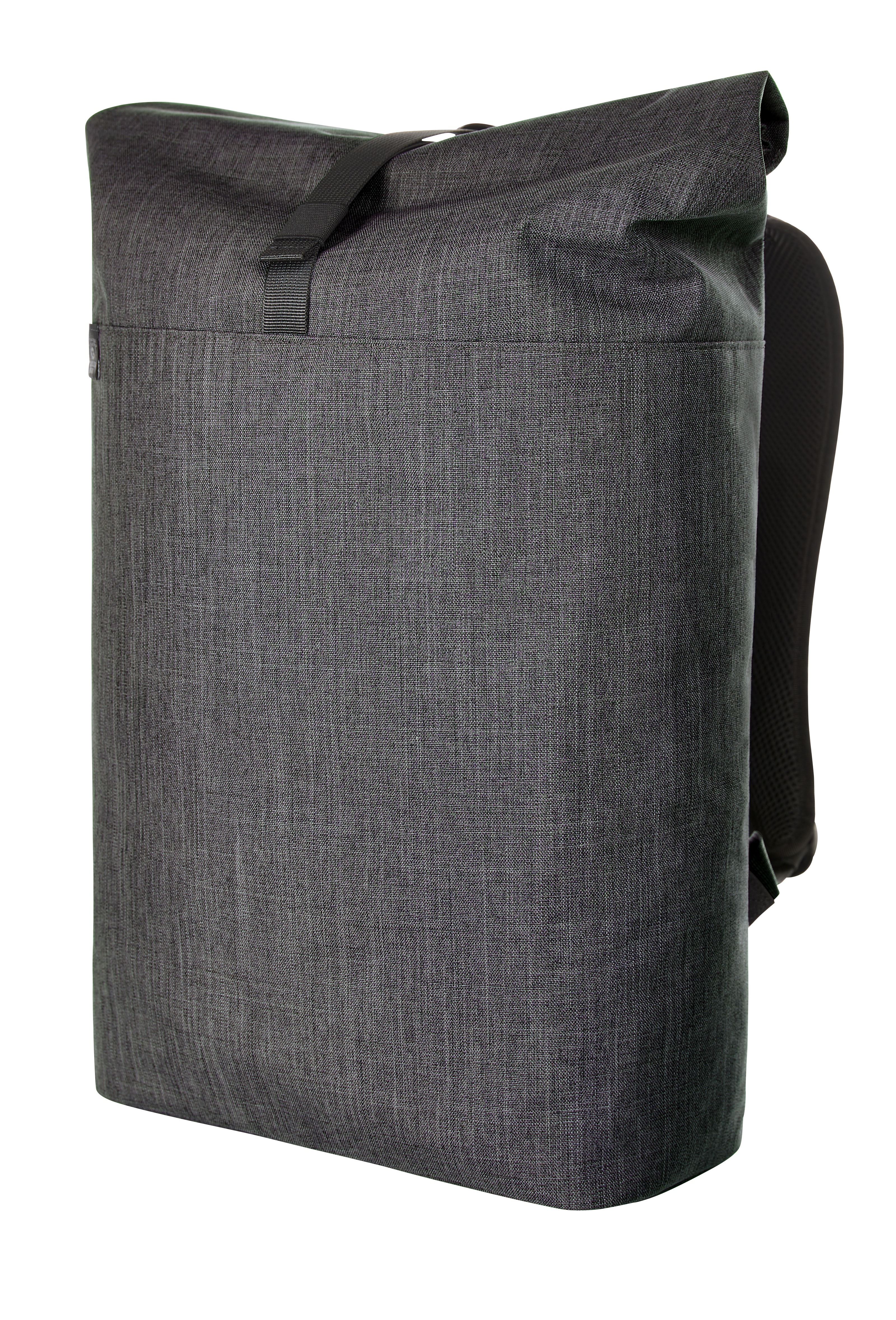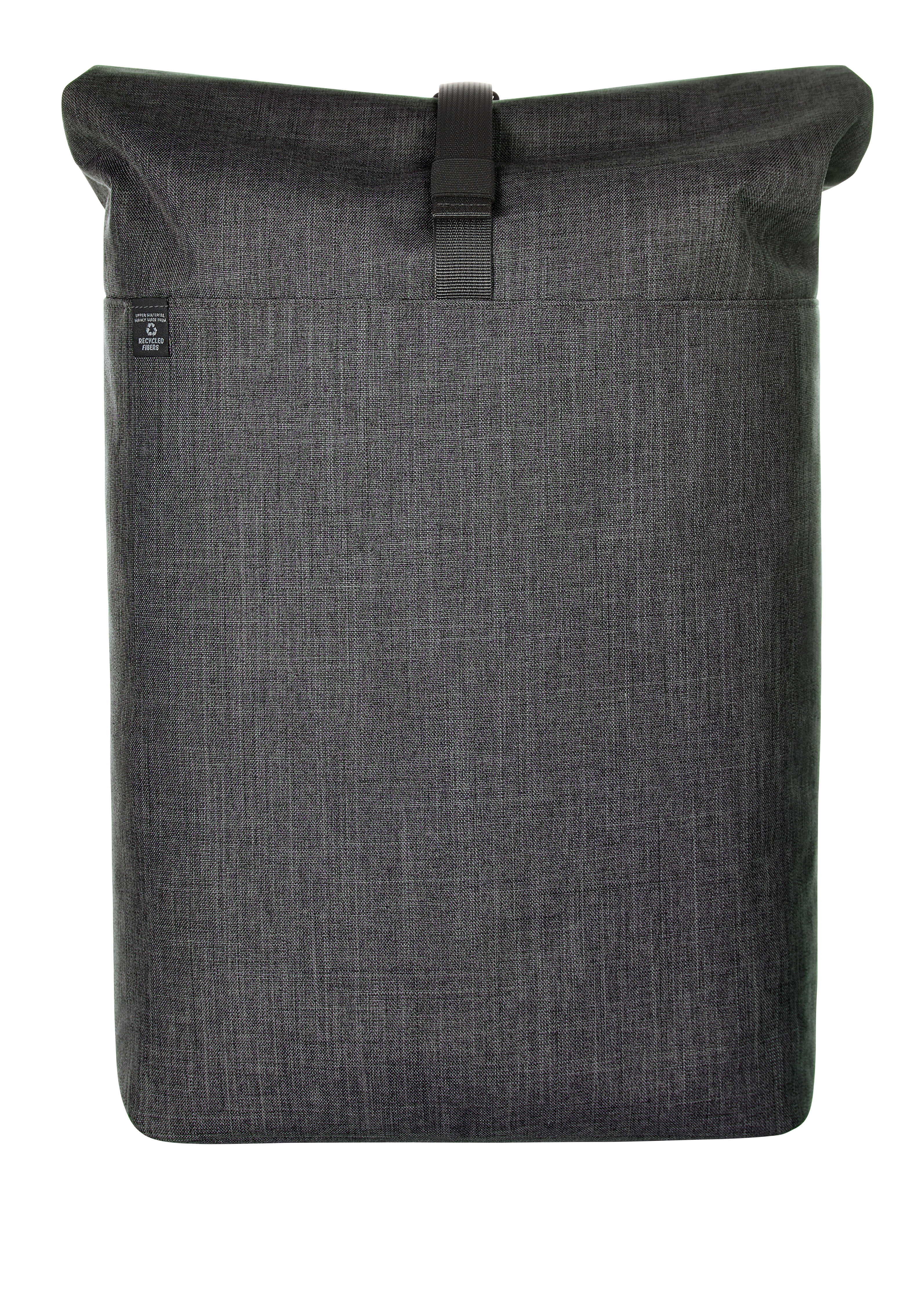 Urbaner Rucksack mit Magnet- und Wickelverschluss; geräumiges Hauptfach mit gepolstertem Notebookfach; rPET Obermaterial; rückseitige Reißverschlusstasche; aufwändig gepolsterter Rücken mit verstecktem Reißverschlussfach; gepolsterter Boden; längenverstellbare gepolsterte Schultergurte mit Gummischlaufen zum Befestigen von z. B. Sonnenbrille; Handgriff