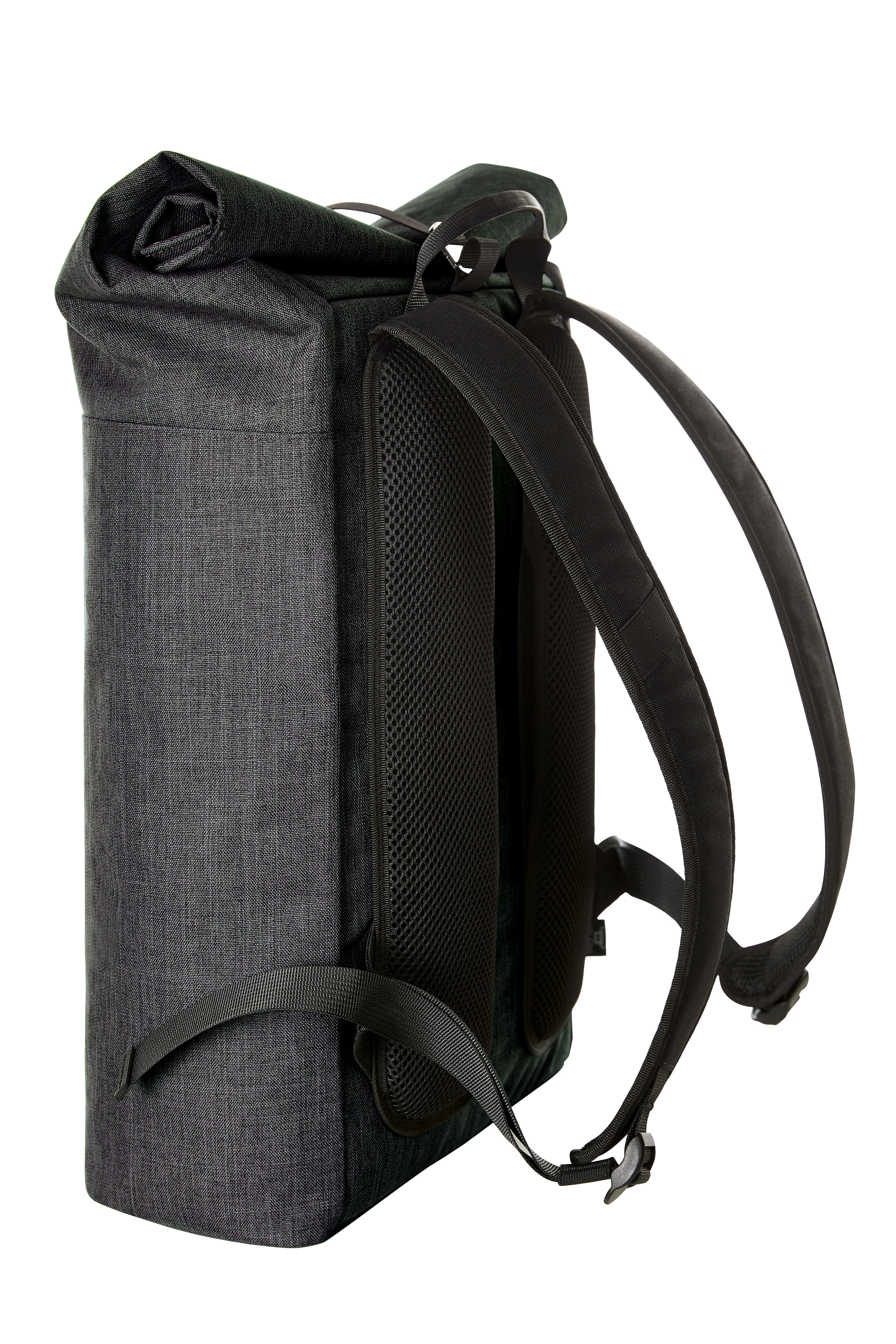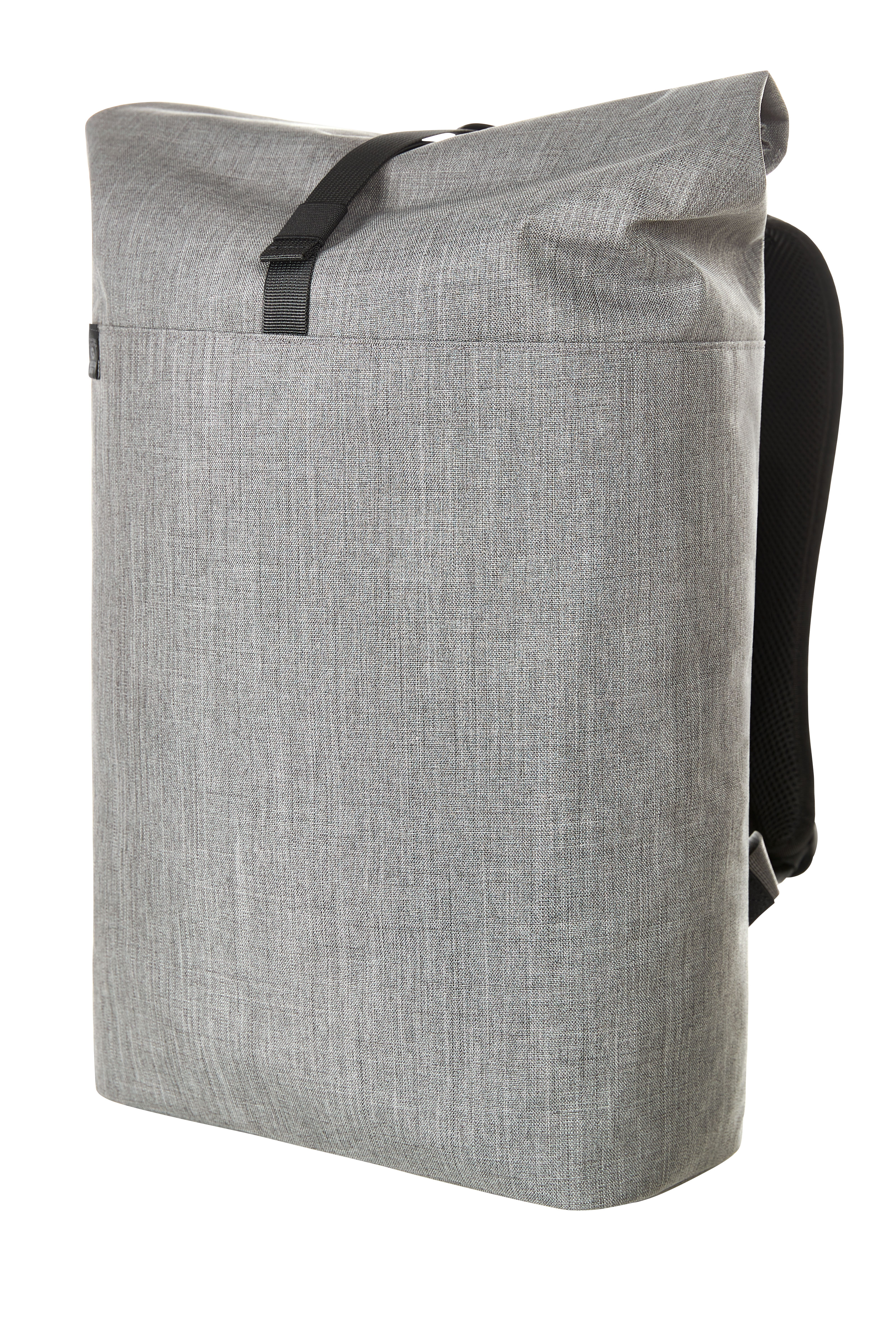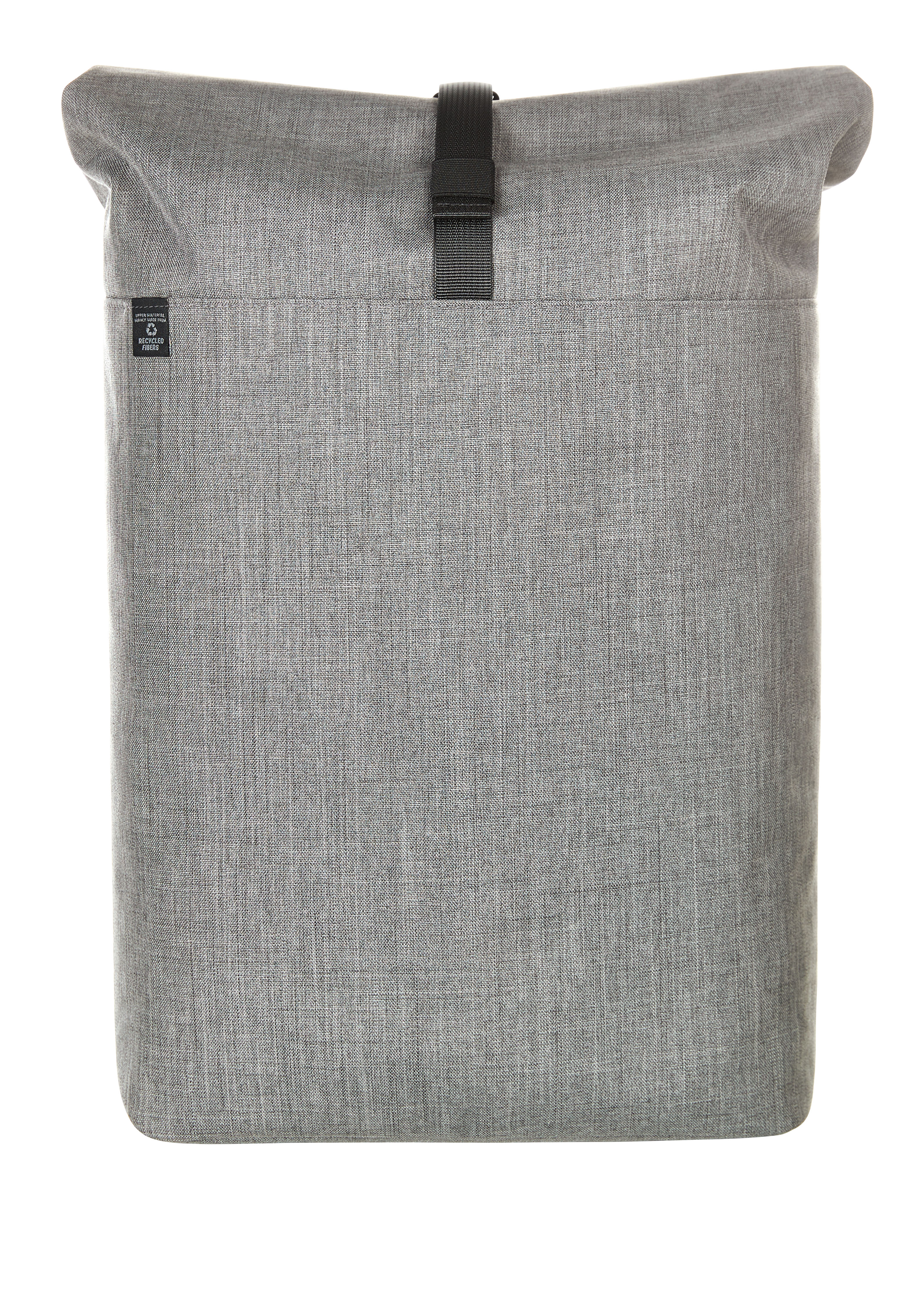 Urbaner Rucksack mit Magnet- und Wickelverschluss; geräumiges Hauptfach mit gepolstertem Notebookfach; rPET Obermaterial; rückseitige Reißverschlusstasche; aufwändig gepolsterter Rücken mit verstecktem Reißverschlussfach; gepolsterter Boden; längenverstellbare gepolsterte Schultergurte mit Gummischlaufen zum Befestigen von z. B. Sonnenbrille; Handgriff