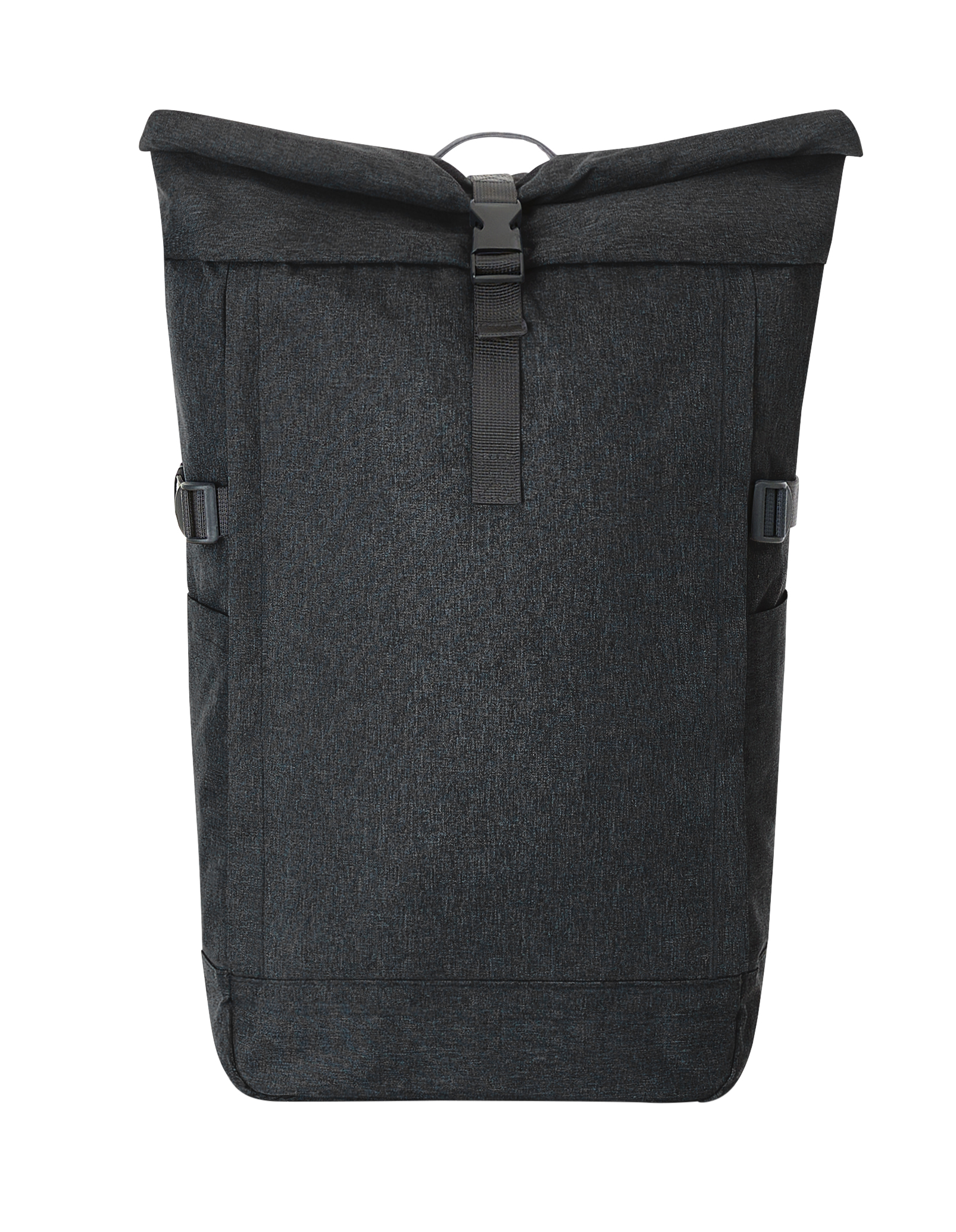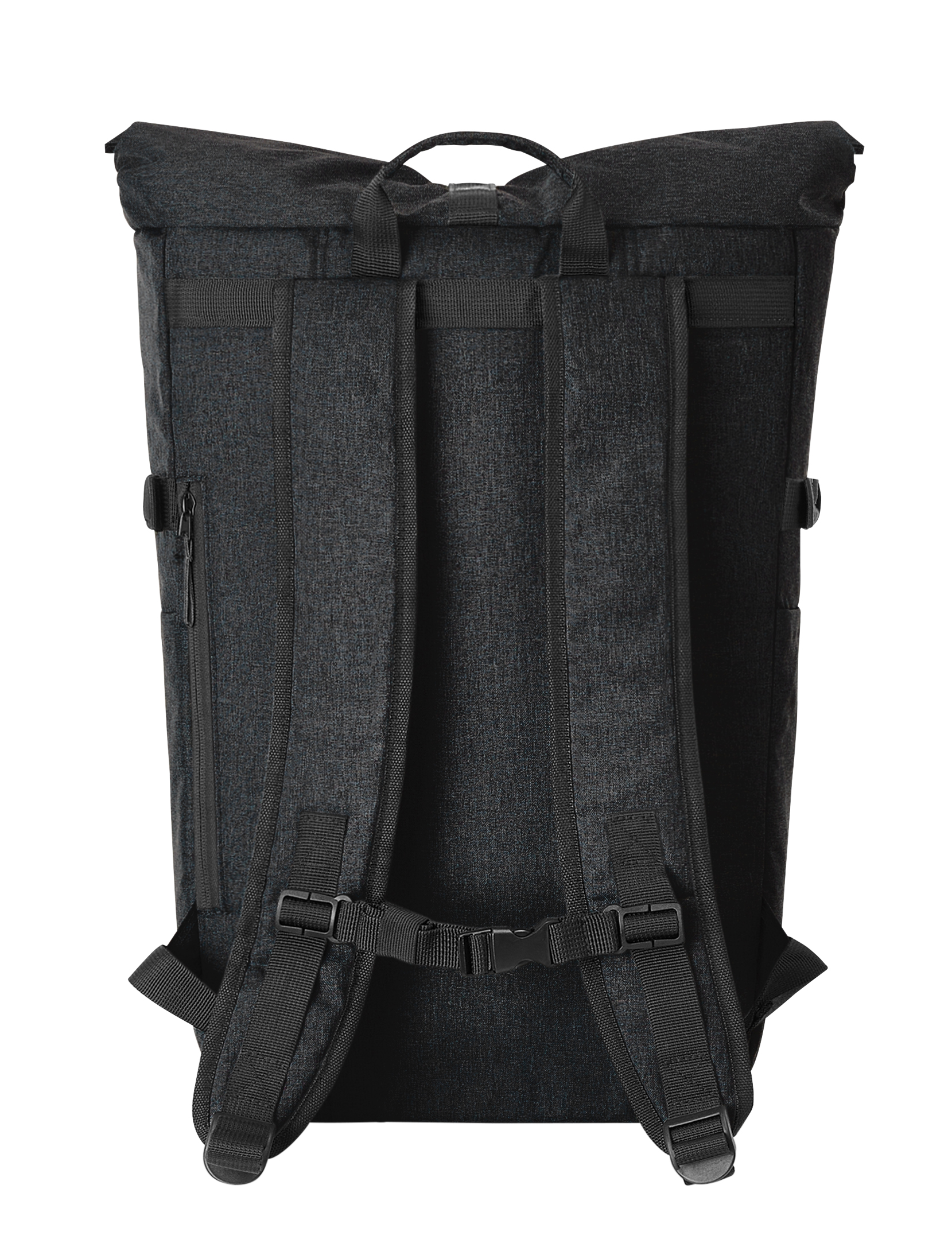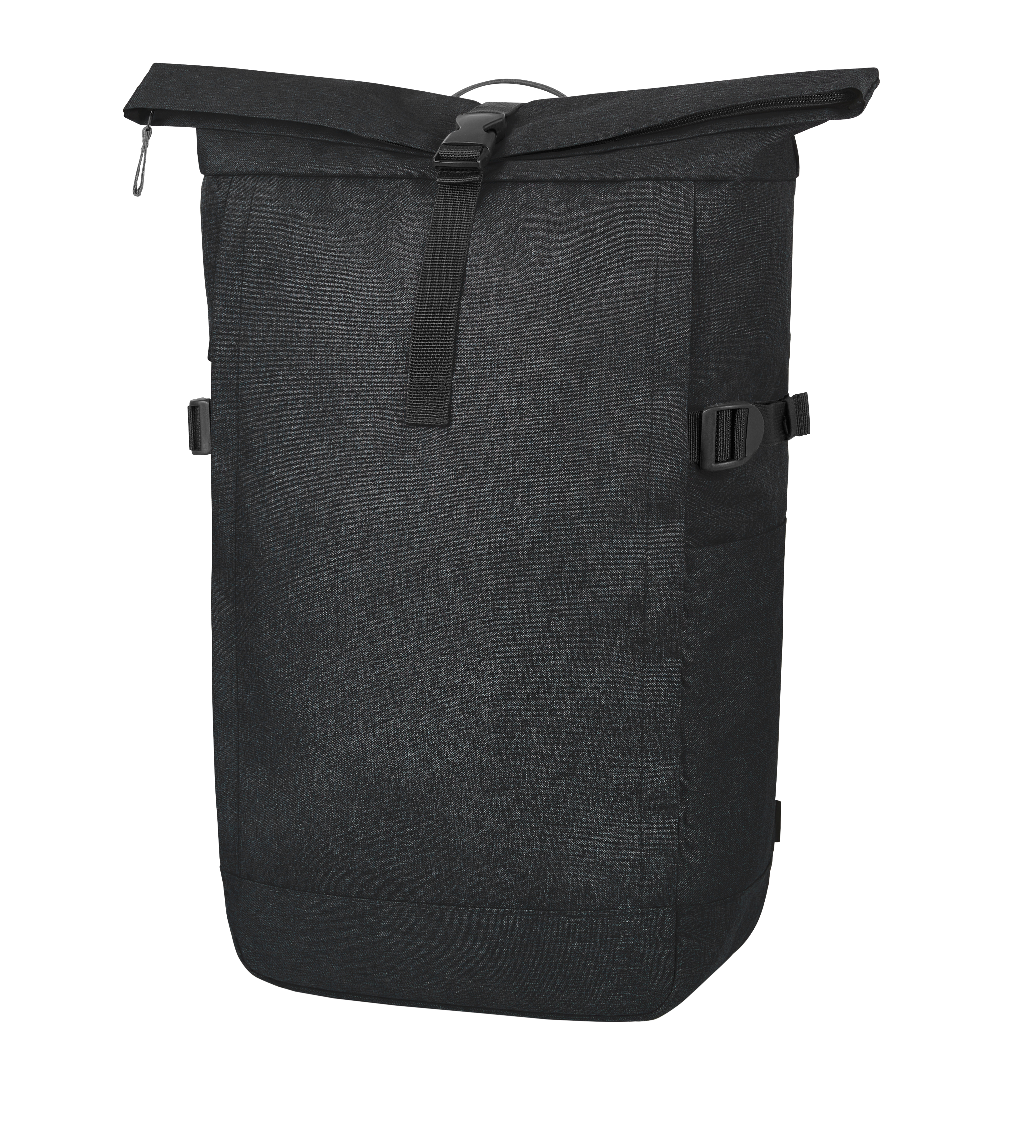 Urbaner Rucksack mit Reißverschluss-Hauptfach und Steckverschluss; RPET-Obermaterial; gepolstertes Einsteckfach und Organizer-Elemente innen; seitliche Reißverschluss-Vortasche; zwei seitliche Einsteckfächer; Fixiergurte; rückseitige Reißverschluss-Tasche; gepolstertes Tragesystem mit höhenverstellbarem Brustgurt; Handgriff