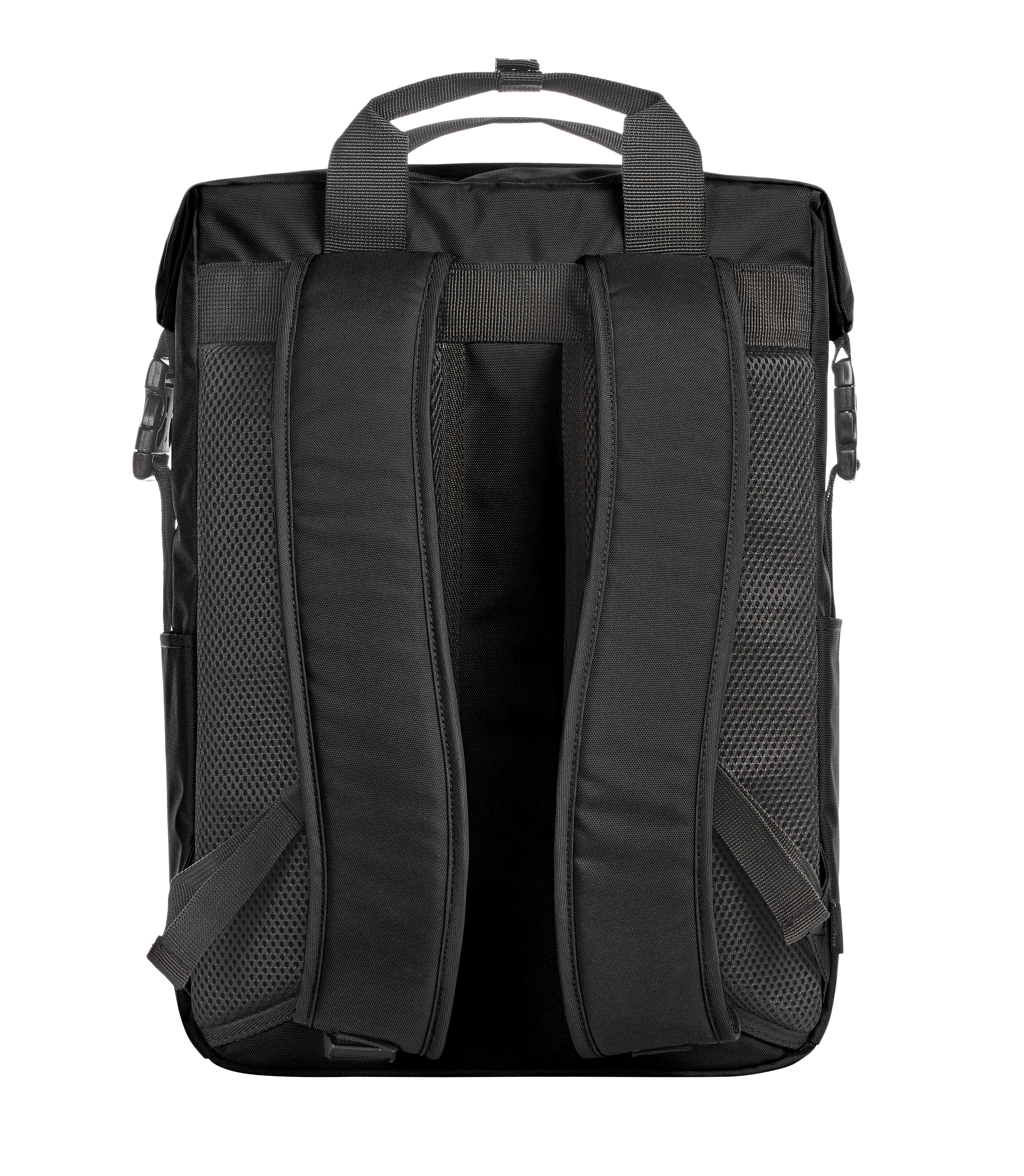 Charmanter rechteckiger Rucksack; RPET-Obermaterial; geräumiges Hauptfach mit 2-Wege-Reißverschluss; gepolstertes Notebookfach; flaches Einsteckfach innen; seitliche Steckschnallen für komfortables Öffnen; Steckschnallen können als Griff verbunden werden; große Reißverschluss-Vortasche; zwei seitliche Einsteckfächer für z. B. Trinkflaschen; gepolstertes Tragesystem; Handgriffe mit Druckknopfmanschette