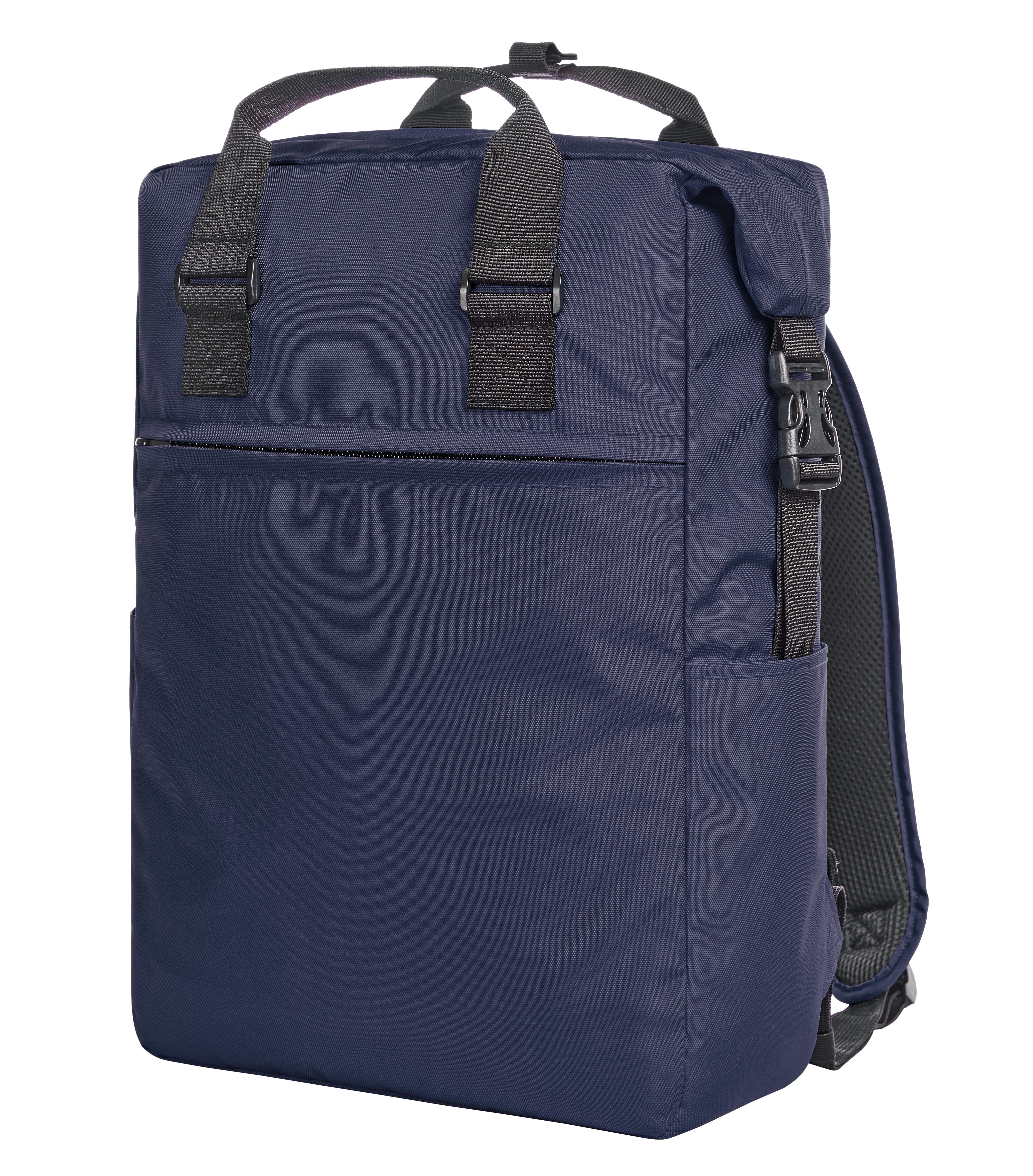 Charmanter rechteckiger Rucksack; RPET-Obermaterial; geräumiges Hauptfach mit 2-Wege-Reißverschluss; gepolstertes Notebookfach; flaches Einsteckfach innen; seitliche Steckschnallen für komfortables Öffnen; Steckschnallen können als Griff verbunden werden; große Reißverschluss-Vortasche; zwei seitliche Einsteckfächer für z. B. Trinkflaschen; gepolstertes Tragesystem; Handgriffe mit Druckknopfmanschette