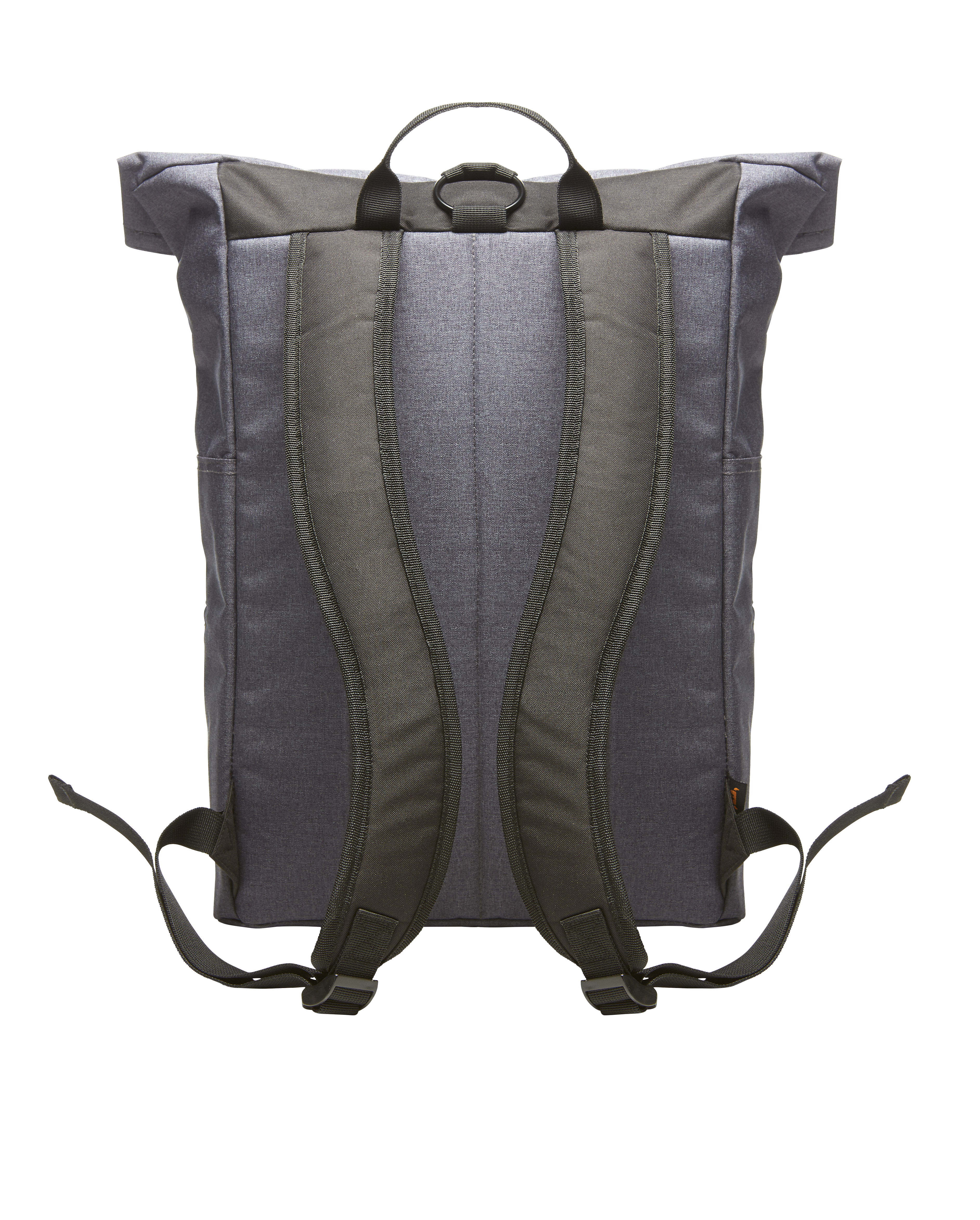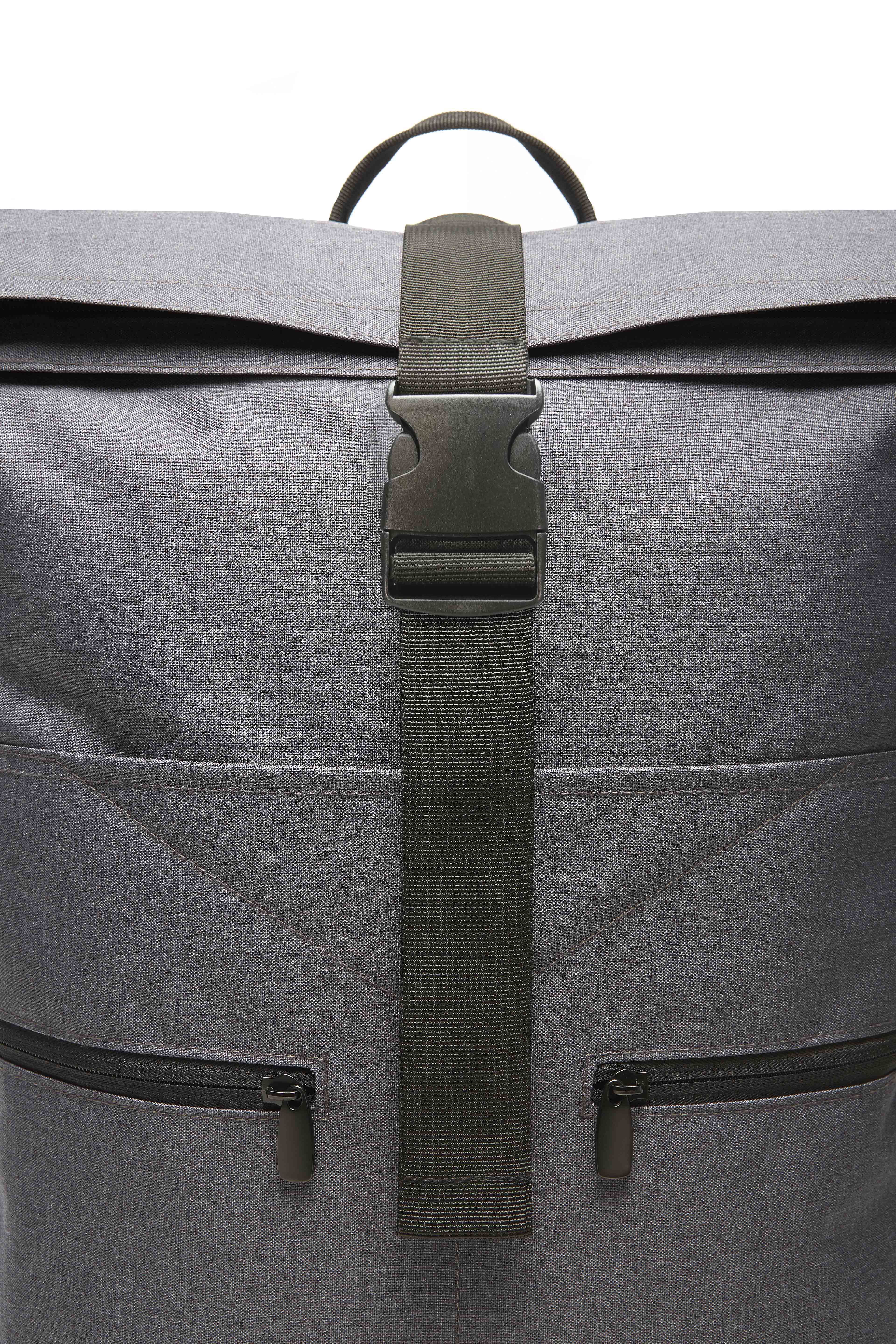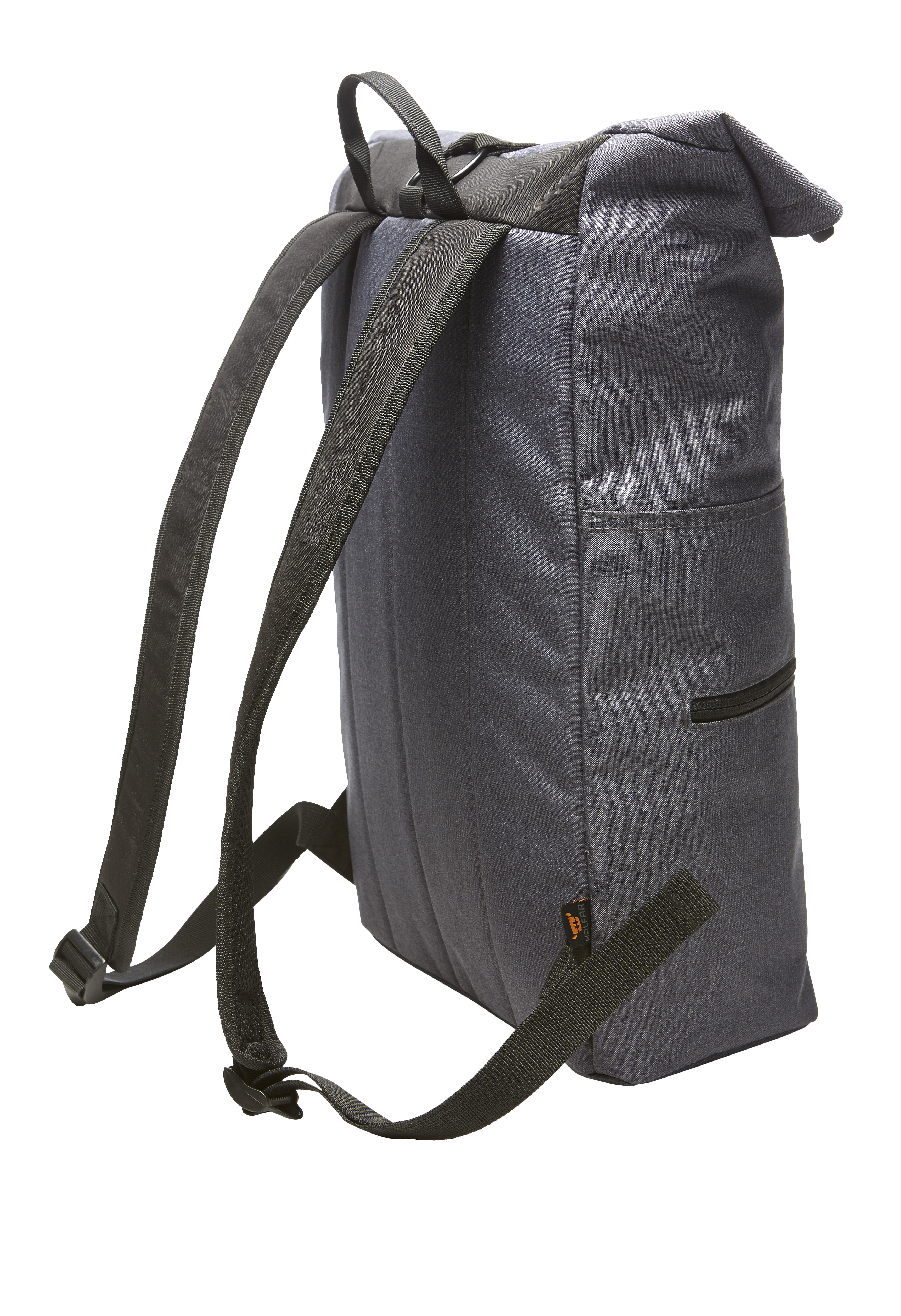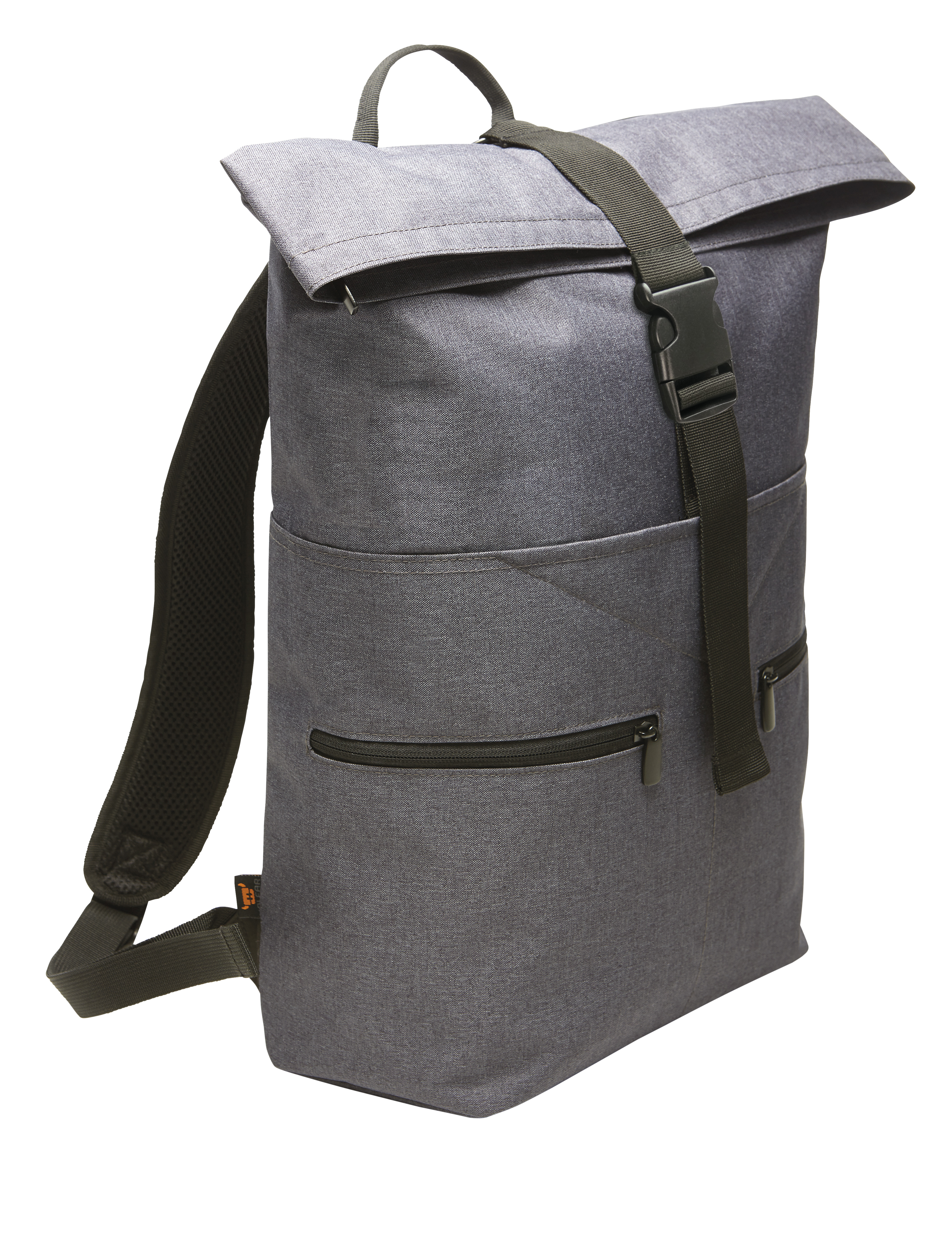 Überschlag-Rucksack mit innovativem Verschlusssystem; großes Hauptfach mit hängendem Reißverschlusstäschchen; gepolstertes Notebookfach; 2 Reißverschluss-Vortaschen; gepolstertes Rücken und Gurte; Handgriff