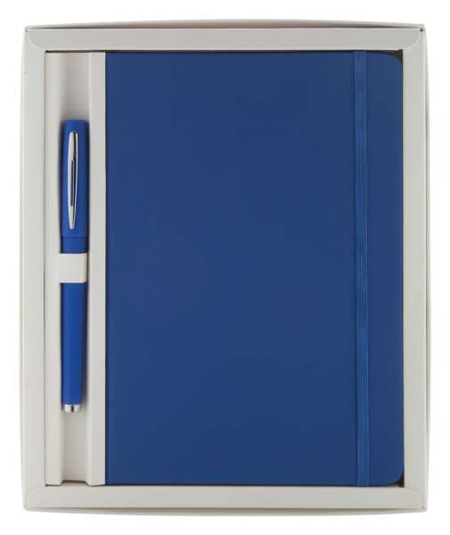Notiz-Set mit A5 Notizbuch mit Kunstledereinband (100 Seiten, blanko) und Kunststoff-Kugelschreiber (blauschreibend). Verpackt in weißer Geschenkbox.