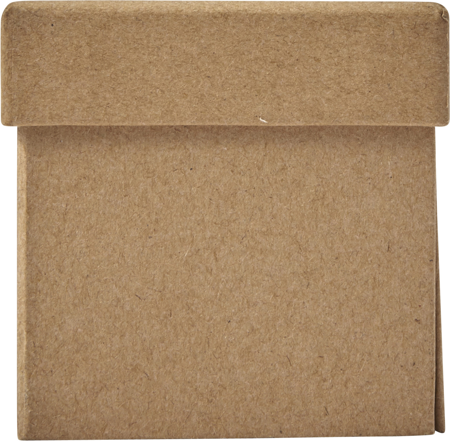 Notizwürfel aus recycelter Pappe, bestehend aus 5x kleinen Haftnotizen (je 25 Blatt) und 1x großen Haftnotizen (80 Blatt), einer Stiftebox und einem Fach für Büroklammern.