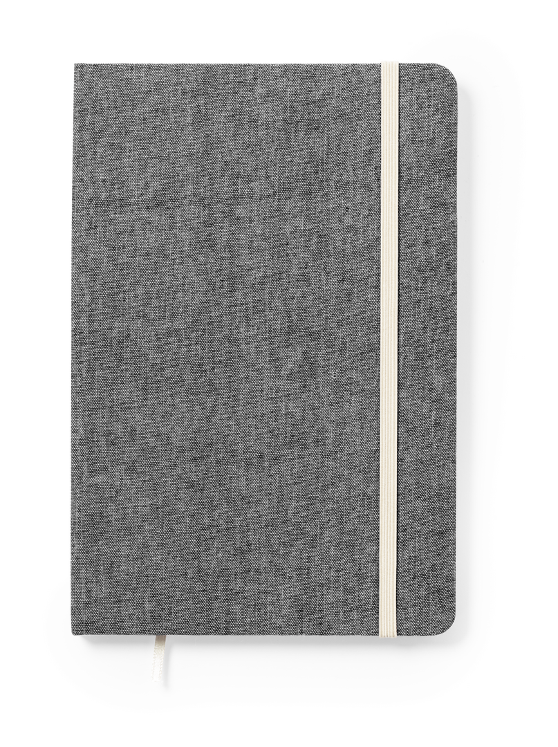 Natur Linie Notizblock aus recycelter Baumwolle. Mit festem Einband und Gummiband in Kontrastfarbe. Innen mit 100 unbedruckten Blättern und Lesezeichen aus Stoff. Erhältlich in einer breiten Farbpalette, mit Logo aus recycelter Baumwolle auf dem hinteren Umschlag. GRS-Zertifizierung (Global Recycled Standard) verfügbar, die die recycelte Herkunft des für die Herstellung des Produkts verwendeten Materials garantiert.