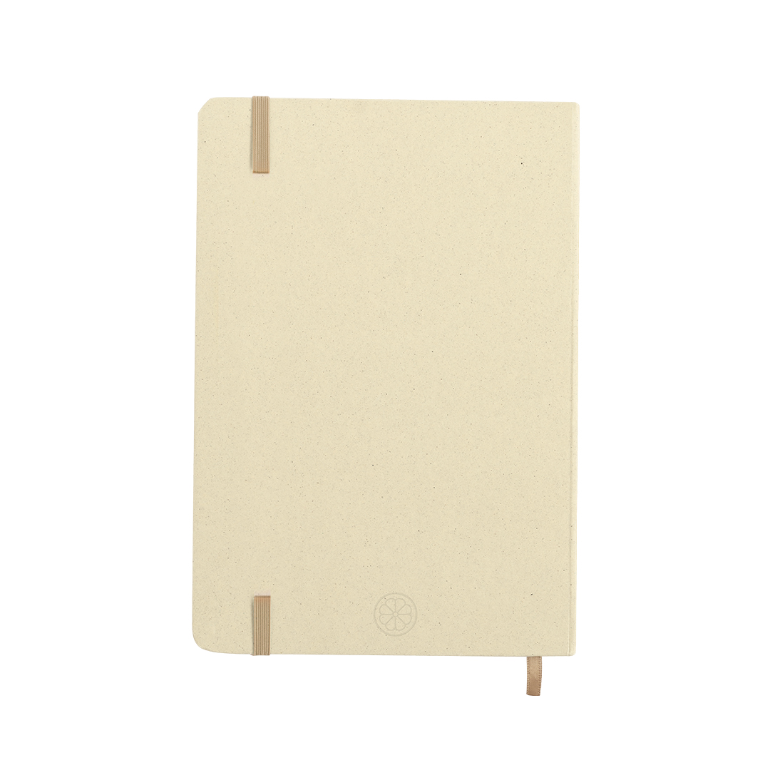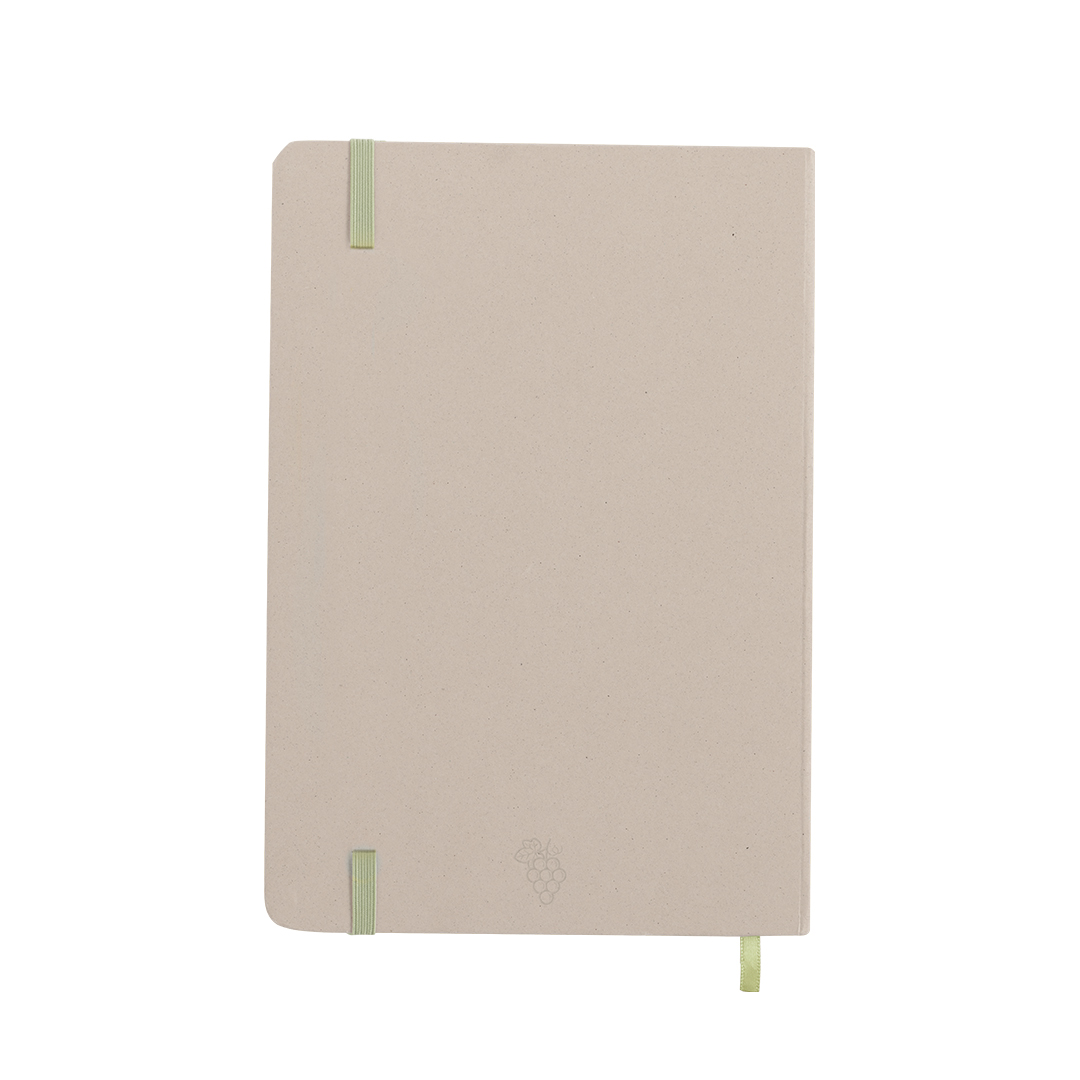 A5 Notizblock mit festem Einband aus Obst. Innen mit 80 linierten Seiten, mit passendem Lesezeichen und Gummiband. Erhältlich in einer Vielzahl von Kraftfarben. Mit Fruit Paper-Logo auf der hinteren Umschlagseite. Präsentiert in einer individuellen recycelten Tasche. Durch die Vermischung von Abfällen und Rückständen aus der Agrar- und Ernährungsindustrie mit anderen recycelten Materialien wird ein zu 100 % nachhaltiges Papier gewonnen: Fruchtpapier. Die Förderung seiner Verwendung ist ein Beitrag zur Wiederverwendung von Materialien und zu einem größeren Umweltengagement.