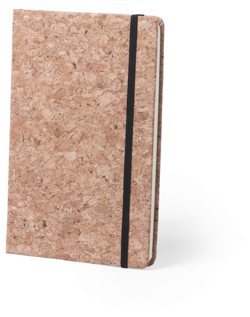 Ökologischer Notizblock aus Naturkork mit festem Cover. Mit 80 Blättern in Naturfarbe, Gummibandverschluss und Lesezeichenband in Schwarz.