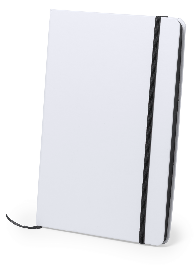Notizblock mit solidem Soft-Touch-Cover in Weiß. Mit 100 Blättern mit farbigen Kanten, Gummibandverschluss und farblich passendem Lesezeichenband.