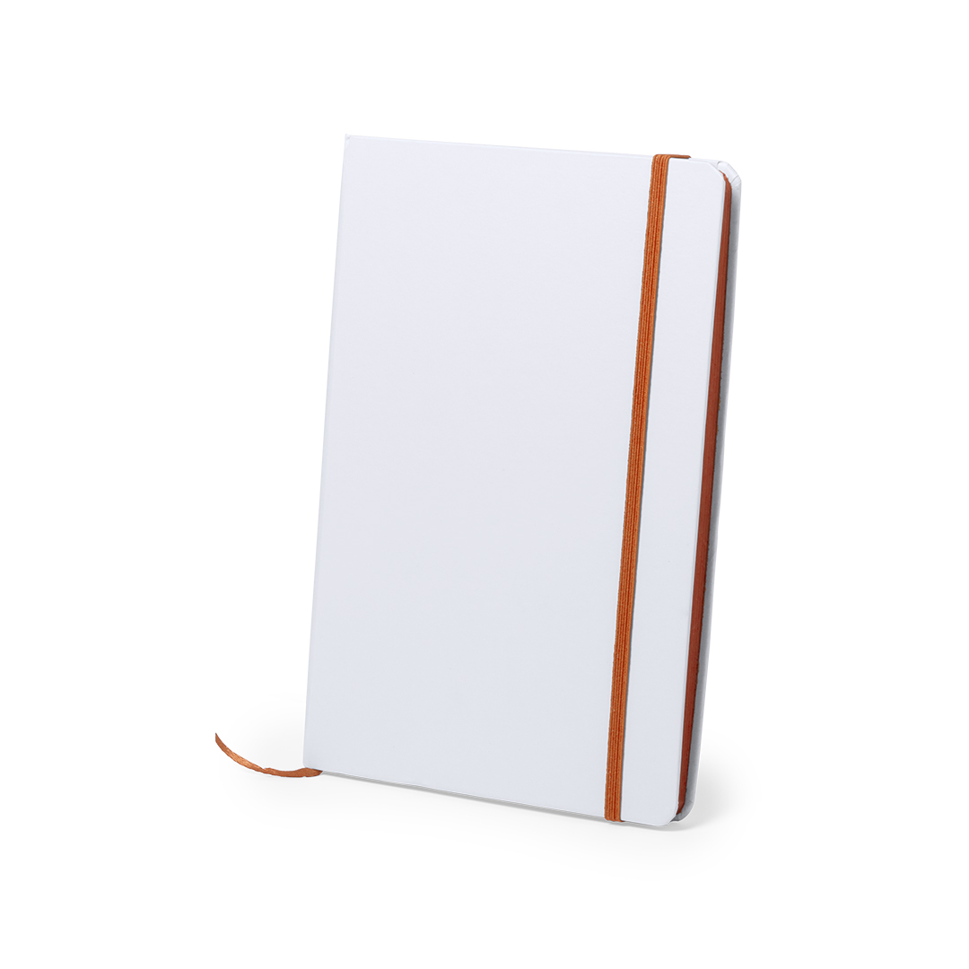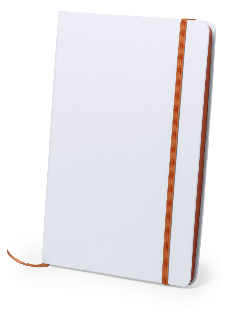 Notizblock mit solidem Soft-Touch-Cover in Weiß. Mit 100 Blättern mit farbigen Kanten, Gummibandverschluss und farblich passendem Lesezeichenband.