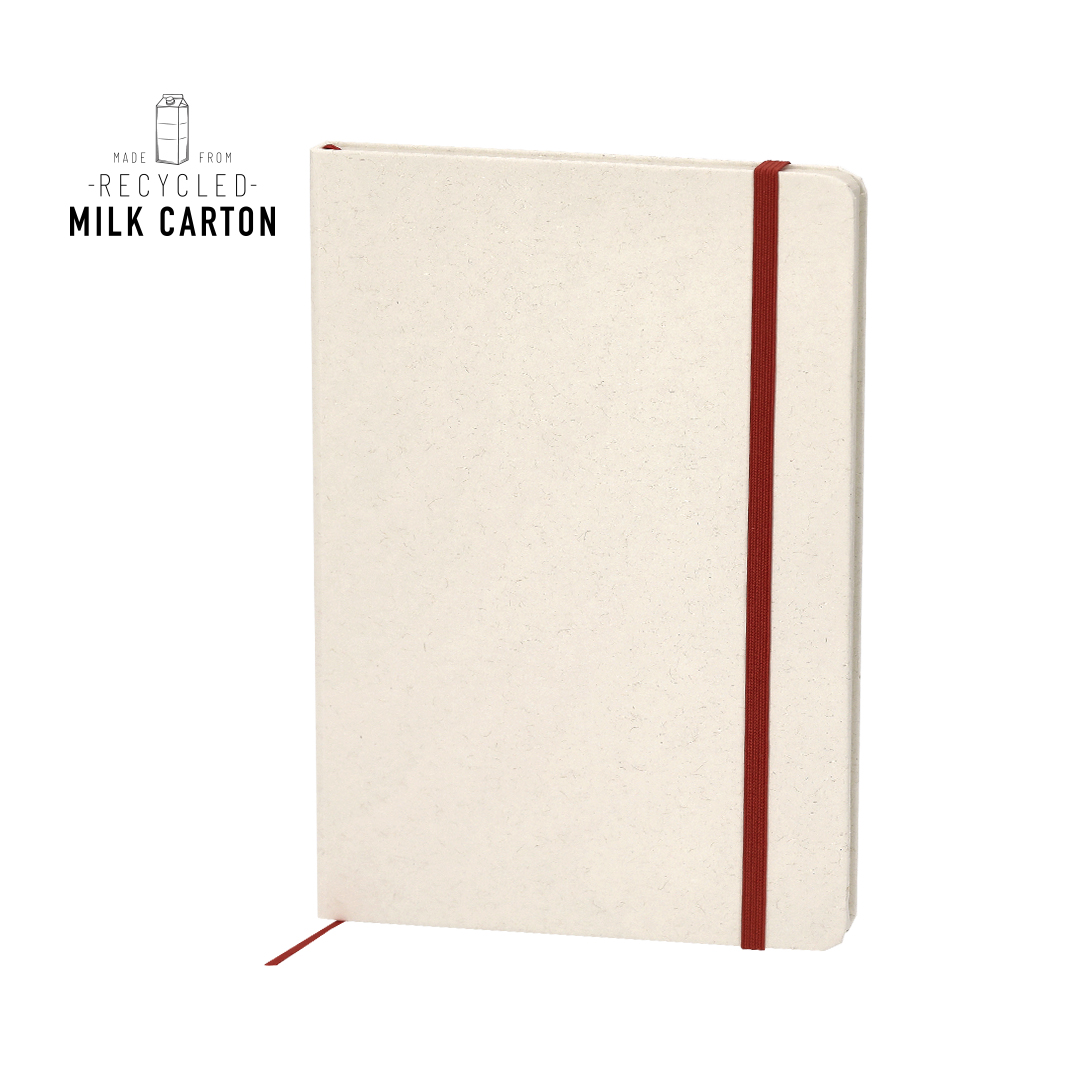 Notizblock mit festen Cover, hergestellt aus recycelten Milchkartons. Beinhaltet 80 Blätter in naturfarbener gestreifter Ausführung, mit elastischem Band und farbigen Lesezeichen. Enthält "Recycled Milk Carton"-Kennzeichnung auf der Rückseite und in den Innenseiten. Die Milchkartons bestehen größtenteils aus Karton und Aluminium. Während des Recyclingprozesses werden die unterschiedlichen Materialien des Behälters getrennt, um wiederverwendet und neu eingesetzt zu werden, und tragen somit dazu bei, den unendlichen Weg der Kreislaufwirtschaft zu beschreiten. Dieses Material zeichnet sich durch einen hohen Recyclinggrad, sowie Leichtigkeit und Widerstandsfähigkeit aus.