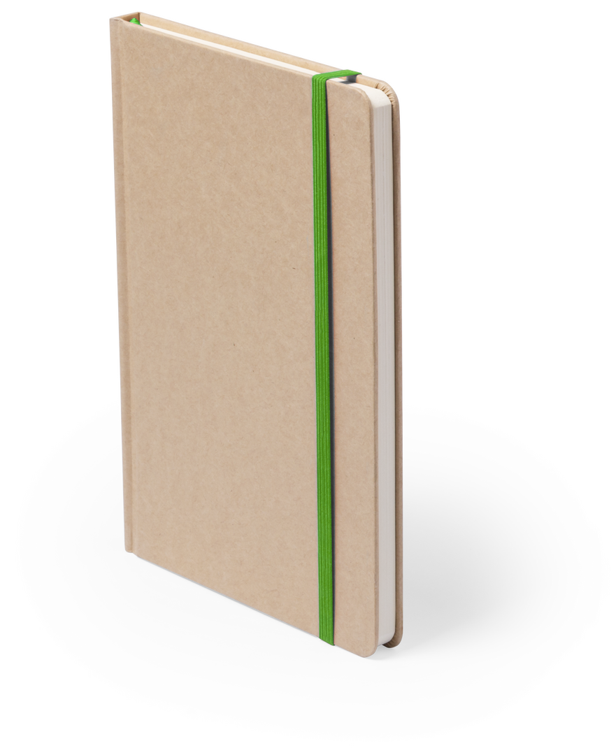 A5-Notizblock mit festem Einband aus stabilem Recyclingkarton. Mit 100 einfachen weißen Blättern und Gummiband zum Verschließen.