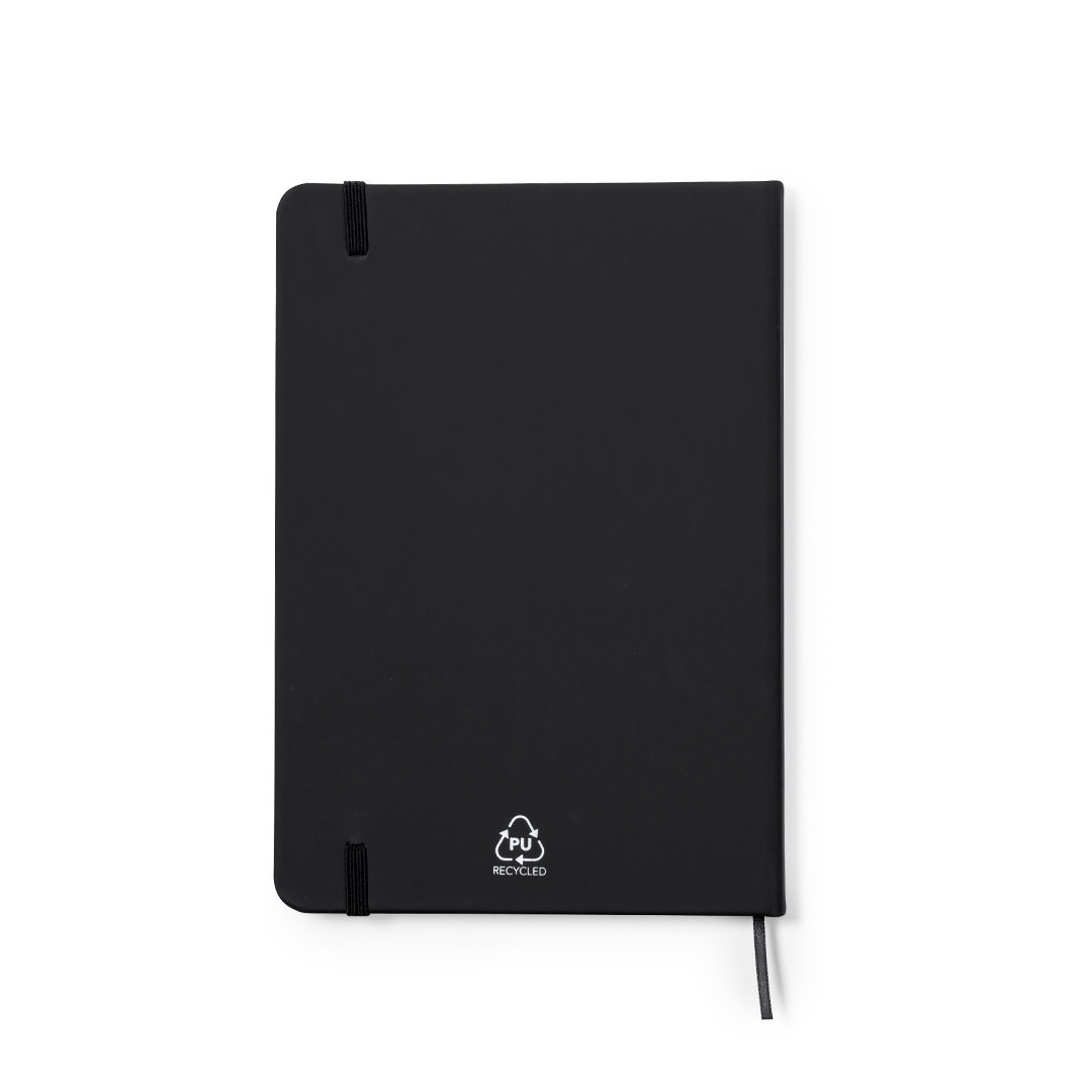 Notizbuch mit festem Einband aus recyceltem Kunstleder in verschiedenen Farben. Innen mit 100 Blättern mit einfarbigem Layout. Mit elastischem Verschluss in der gleichen Farbe. Mit Abzeichen aus recyceltem Kunstleder. Das Kunstleder zeichnet sich durch seine Widerstandsfähigkeit und Elastizität aus. Dieses recycelte und wiederverwertbare Material ist eine nachhaltige Option, bei der die bei der Herstellung weggeworfenen Fasern wiederverwertet werden, wodurch die Materialverschwendung minimiert und die Umweltbelastung verringert wird, während die ursprünglichen Eigenschaften erhalten bleiben.