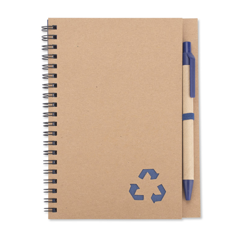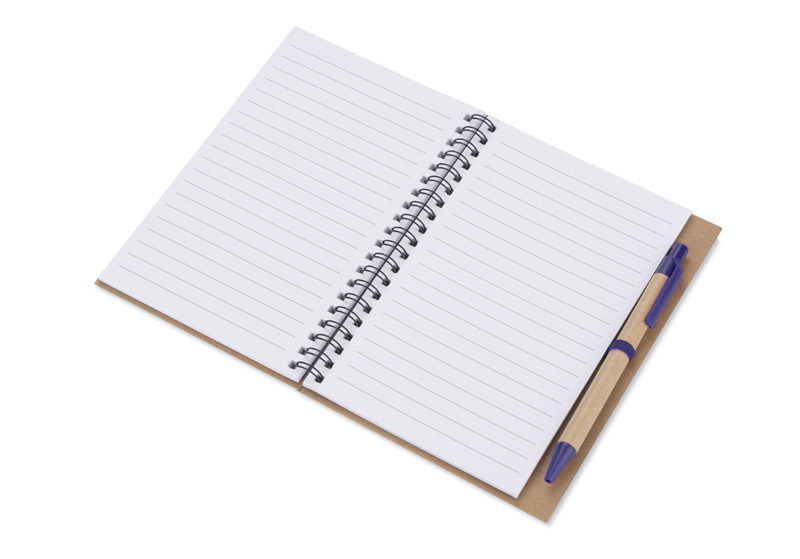 SERENO-Spiralnotizbuch mit klassischem Papiereinband. Es besteht aus 70 linierten Blatt Papier. Das Notizbuch verfügt über einen Stift an einer profilierten Stelle, dessen Körper aus Papier besteht. Die Oberfläche des Stifts ist farblich auf die Trennlinie des Notizbuchs abgestimmt. Blaue Kugelschreibermine.