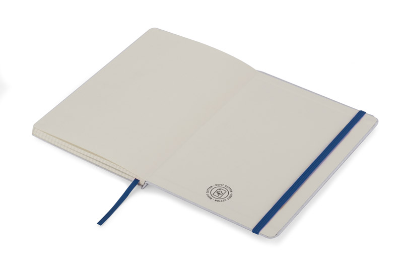 Das MOSATO-Notizbuch passt perfekt zu den Öko-Trends. Der Einband des Notizbuchs besteht aus dem Material Refit Cotton – es handelt sich um ein ökologisches Upcycling-Papier, das mit einer Beimischung von Baumwollfasern hergestellt wird. Es besteht aus 80 karierten Blätter aus Recyclingpapier. Verschlossen mit einem farbigen Gummiband.