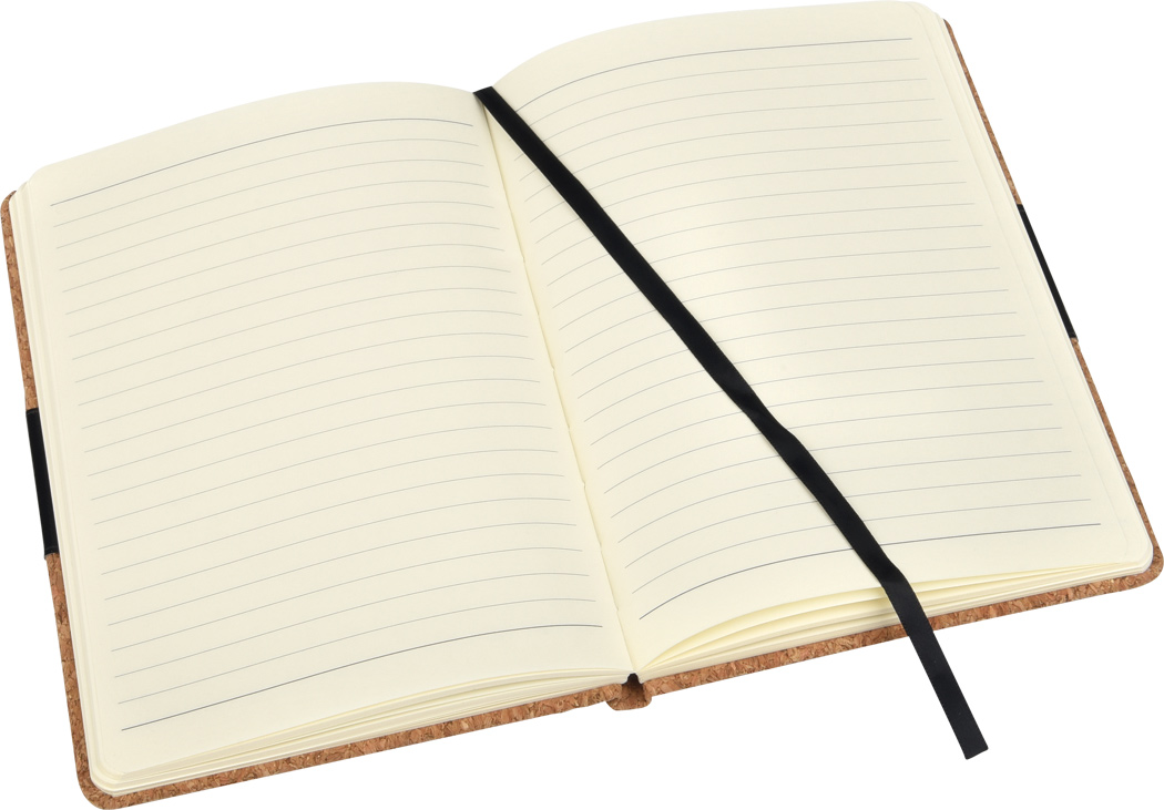 Notizbuch AMBIENCE: im DIN-A5-Format mit abgerundeten Ecken, Gummiband zum Verschließen, mit integriertem Lesezeichen, 90 Blätter, liniert, 70 g / m² - Einband aus Kork mit PU-Zierstreifen