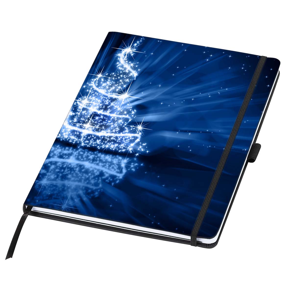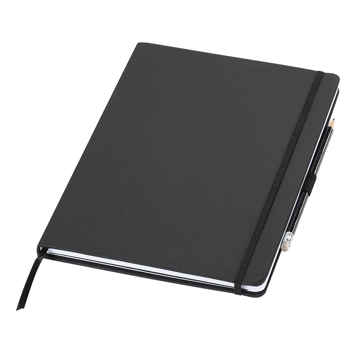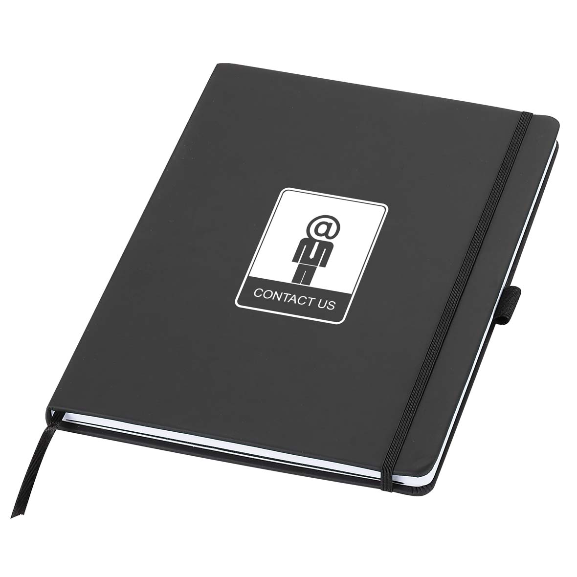 PVC beschichtetes Notizbuch mit schwarzem Gummiband, Innenband, Stift-Halteschlaufe und 96 Blatt (kariert) im Format DIN A4. Papierqualität: weiß 70g / qm, double-side offset. Mit Papiertasche auf hinterer Umschlagklappe.