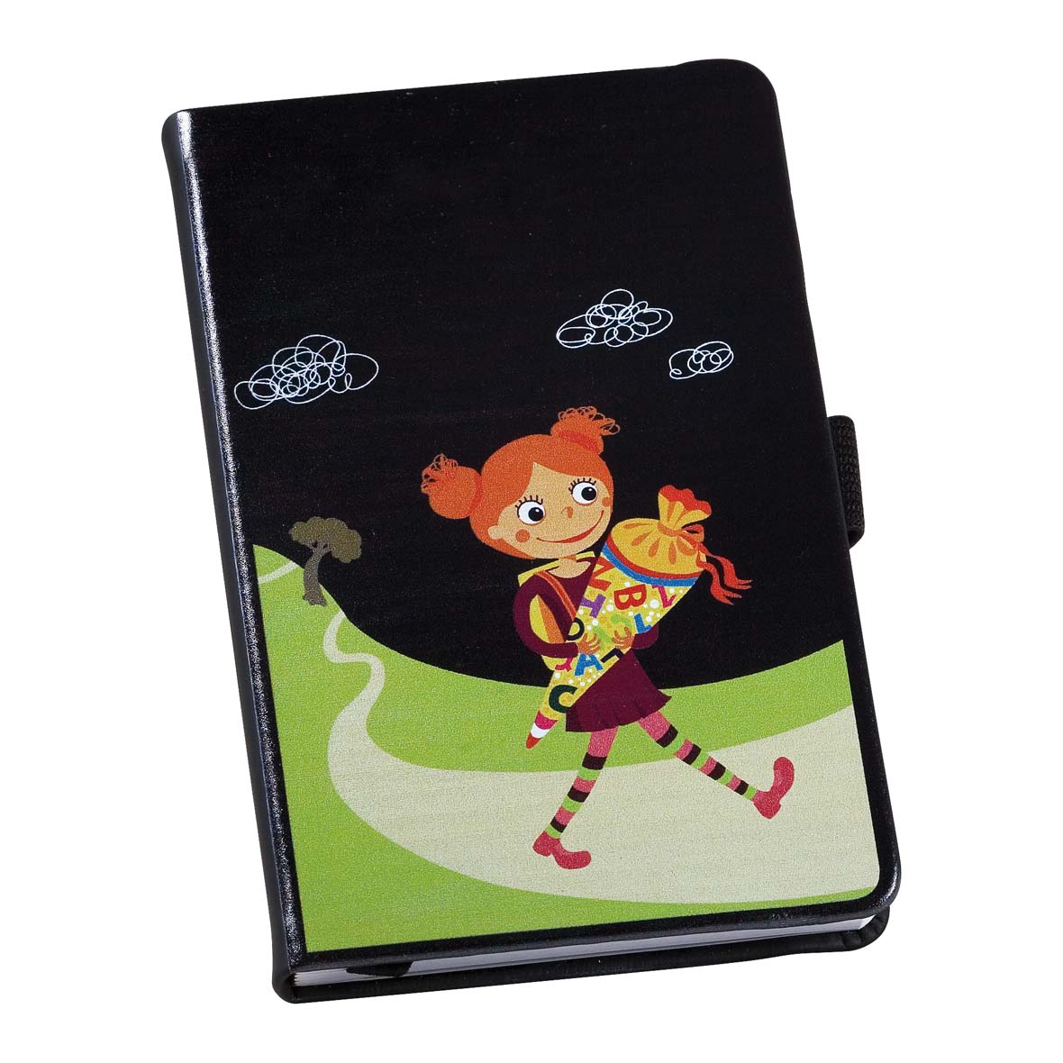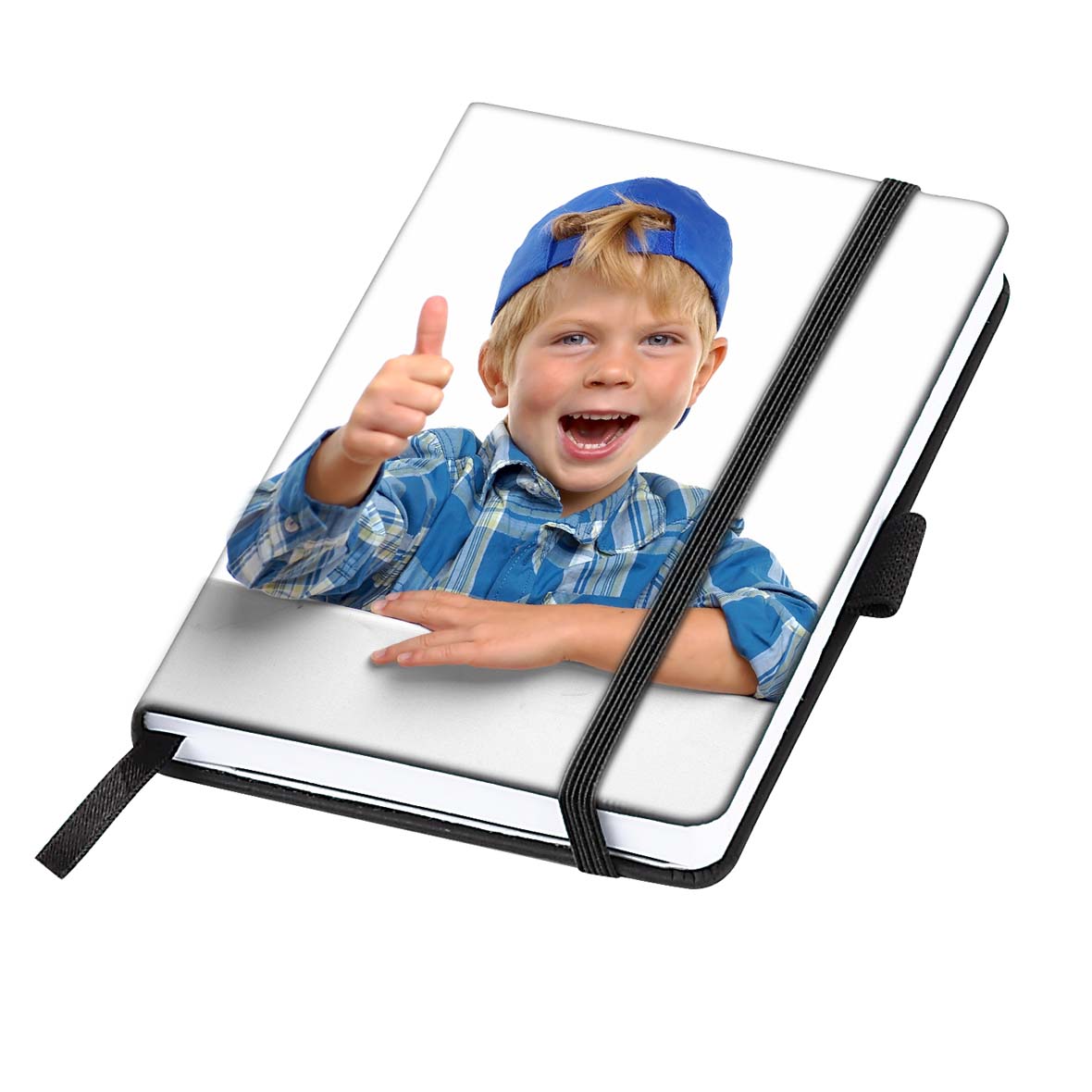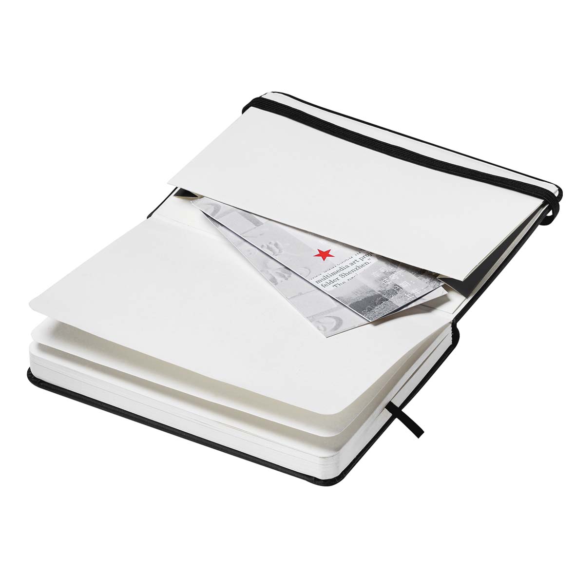 PVC beschichtetes Notizbuch mit schwarzem Gummiband, Innenband, Stift-Halteschlaufe und 96 Blatt (kariert) im Format DIN A6. Papierqualität: weiß 70g / qm, double-side offset. Mit Papiertasche auf hinterer Umschlagklappe.