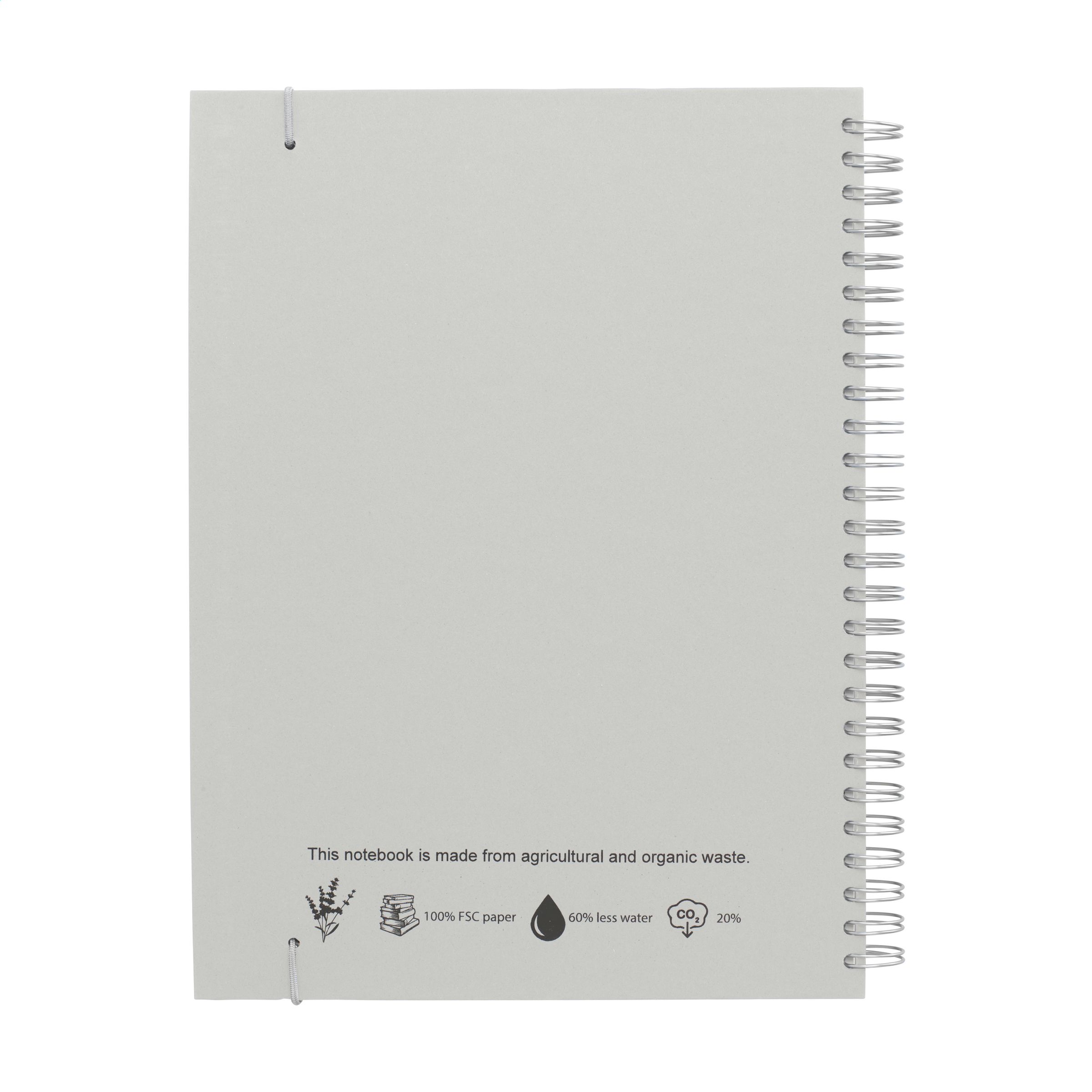 WoW! Notizbuch im A5-Format. Mit 100 Blatt/200 Seiten liniertem Papier (80 g / m²), einer stabilen Wire-O-Bindung und einem Verschlussgummi. Der Hardcover-Einband besteht zu 15% aus landwirtschaftlichen und organischen Abfällen, z. B. von Tomaten, Paprika, Pflanzen und Zwiebeln. Diese Abfälle werden mit Recyclingpapier aus Europa gemischt. Ein praktisches Notizbuch, um Ideen zu notieren und festzuhalten.