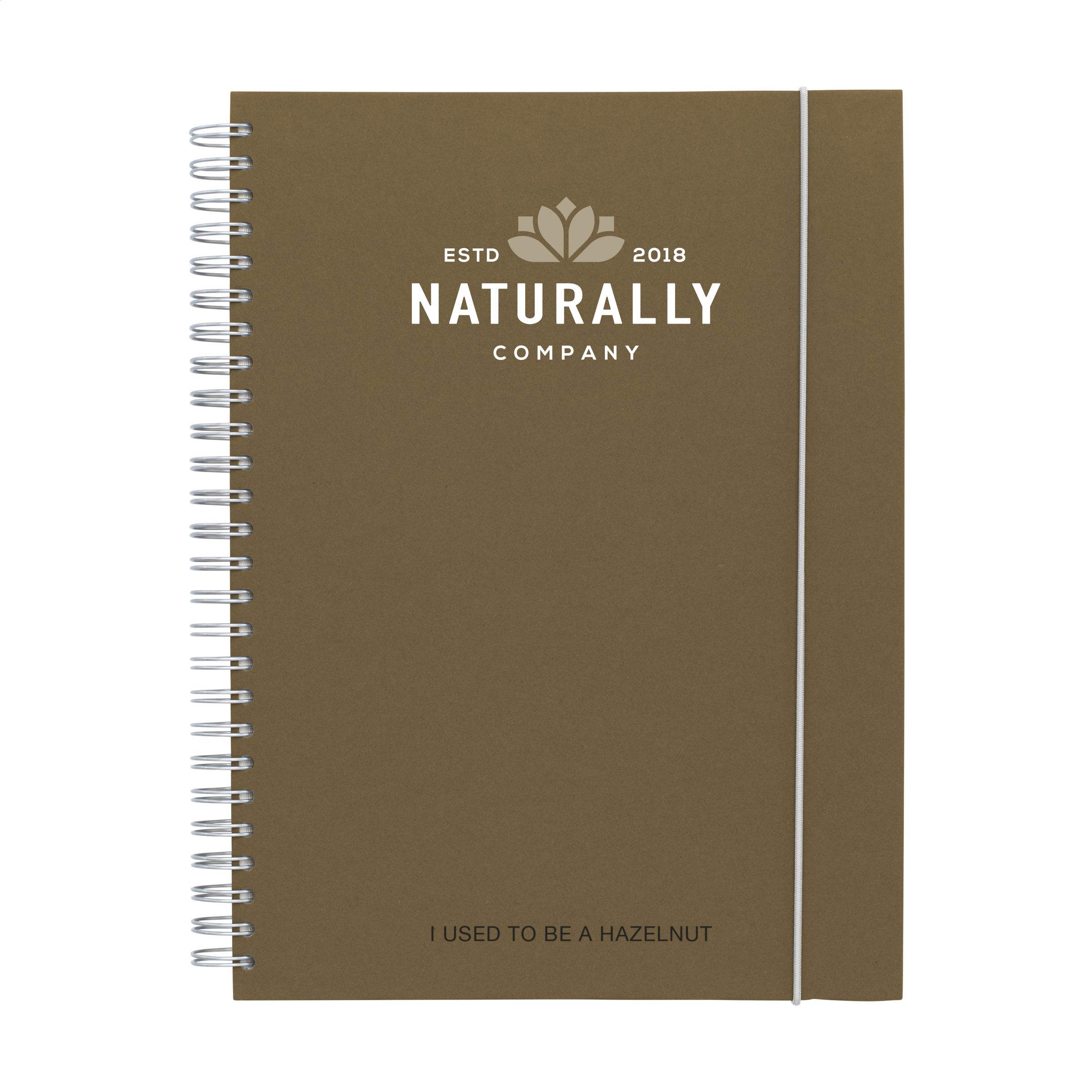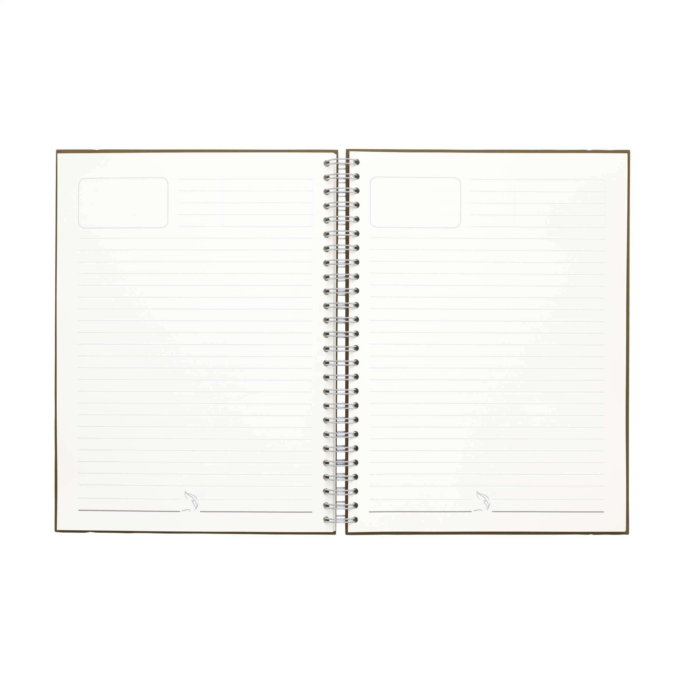 WoW! Notizbuch im A5-Format. Mit 100 Blatt/200 Seiten liniertem Papier (80 g / m²), einer stabilen Wire-O-Bindung und einem Verschlussgummi. Der Hardcover-Einband besteht zu 15% aus landwirtschaftlichen und organischen Abfällen, z. B. von Tomaten, Paprika, Pflanzen und Zwiebeln. Diese Abfälle werden mit Recyclingpapier aus Europa gemischt. Ein praktisches Notizbuch, um Ideen zu notieren und festzuhalten.