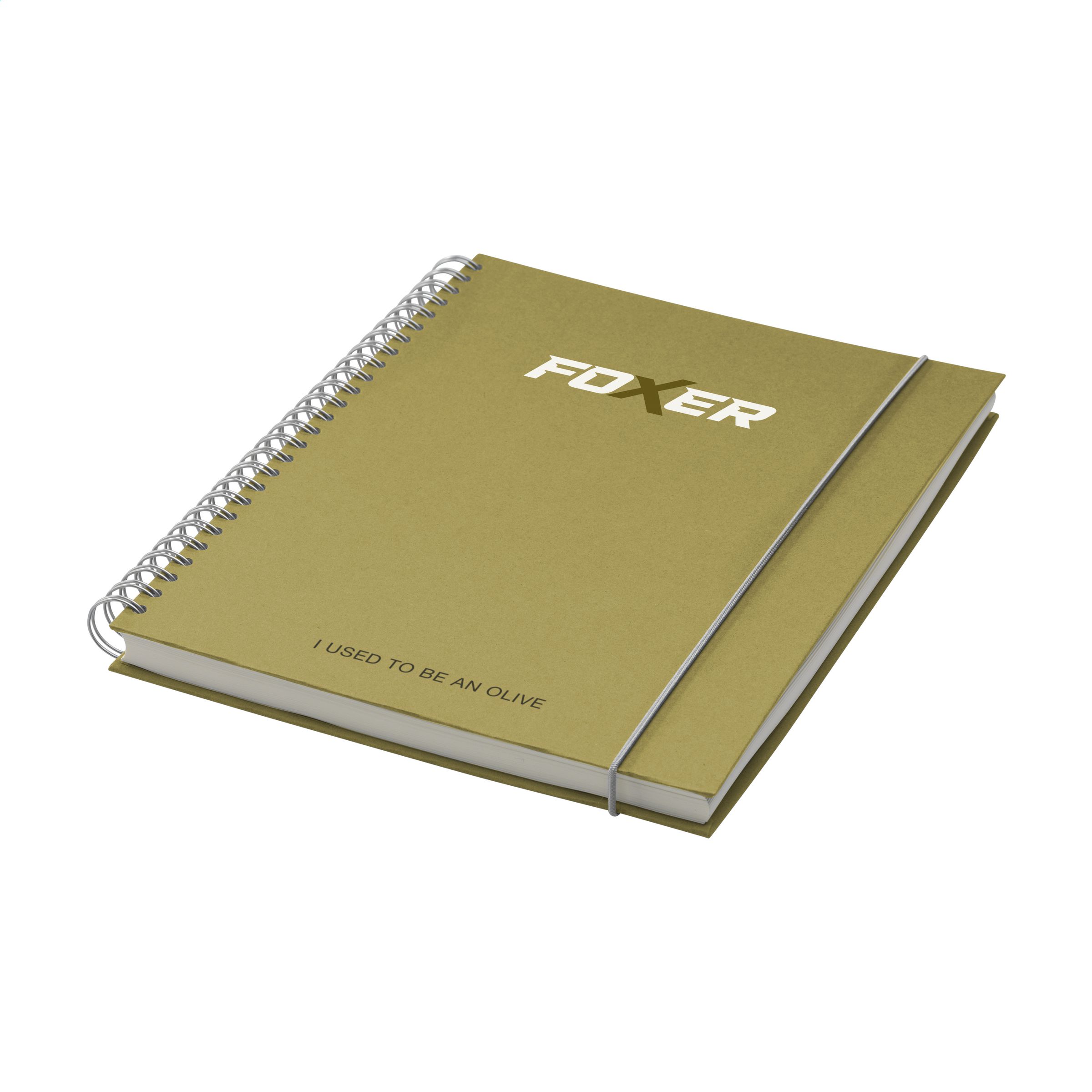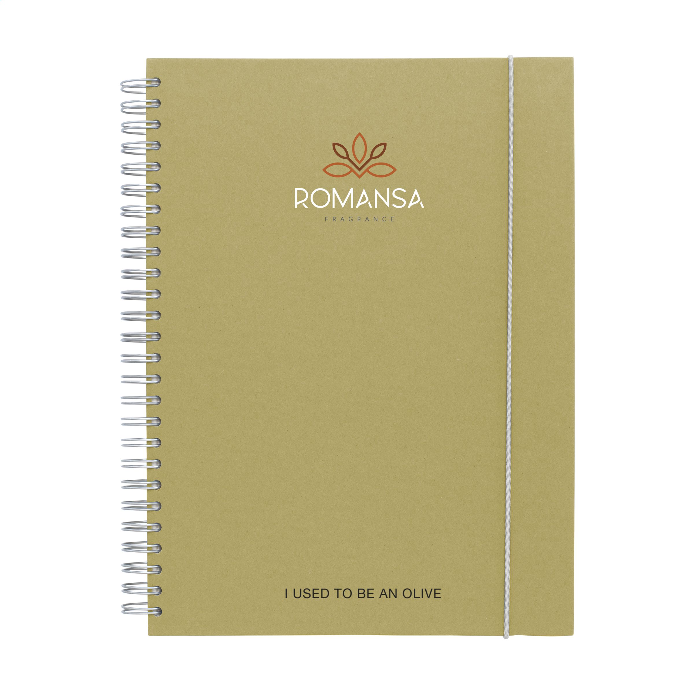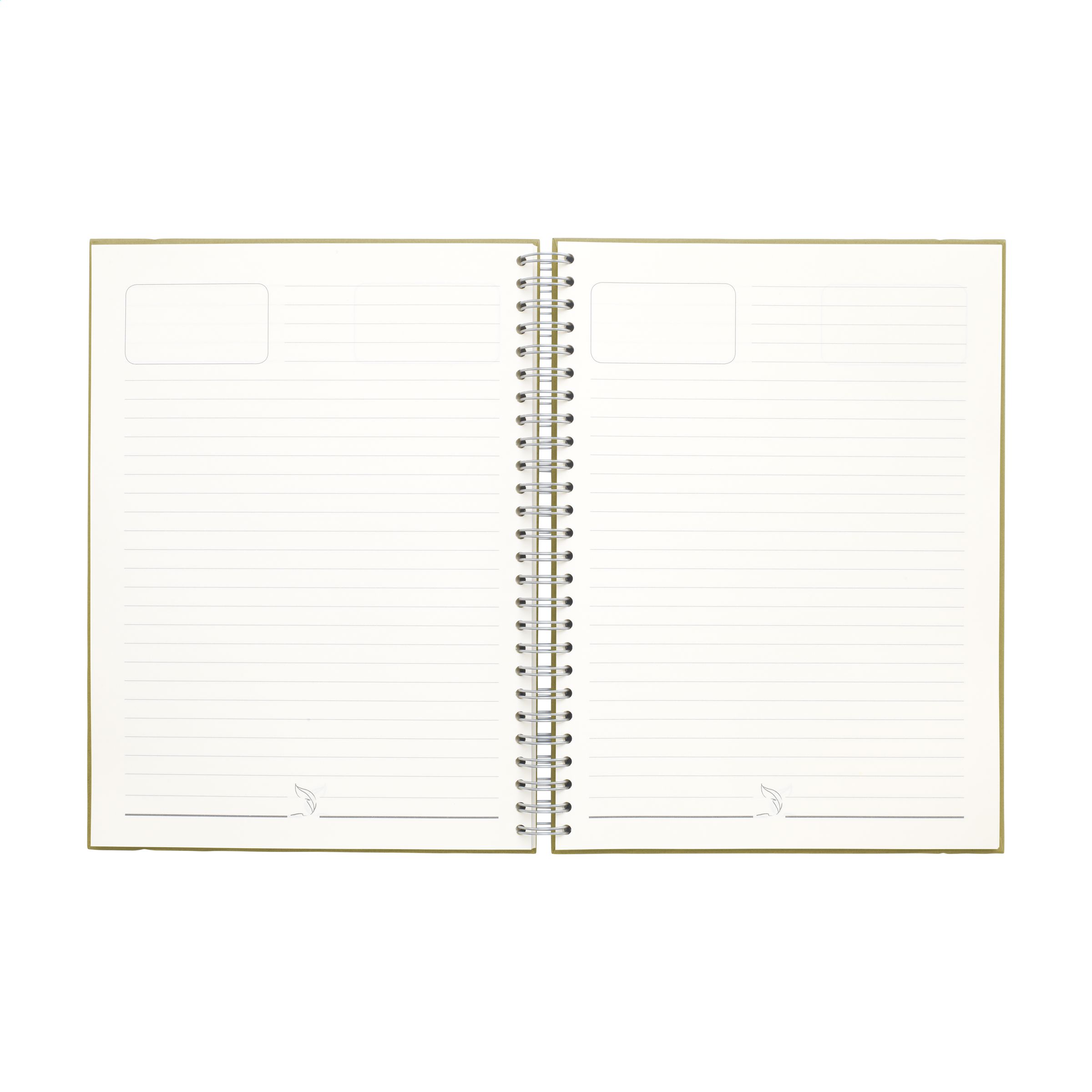 WoW! Notizbuch im A5-Format. Mit 100 Blatt/200 Seiten liniertem Papier (80 g / m²), einer stabilen Wire-O-Bindung und einem Verschlussgummi. Der Hardcover-Einband besteht zu 15% aus landwirtschaftlichen und organischen Abfällen, z. B. von Tomaten, Paprika, Pflanzen und Zwiebeln. Diese Abfälle werden mit Recyclingpapier aus Europa gemischt. Ein praktisches Notizbuch, um Ideen zu notieren und festzuhalten.